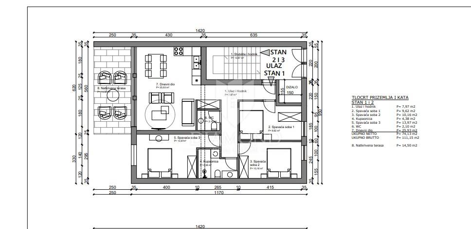 This three-bedroom apartment on the ground floor with its own garden is located in Poreč, near the sea. Its total gross area is 111.15 m2, and the net area is 81.38 m2 with a terrace, and it consists of a spacious open space concept living room with kitchen and dining room, three comfortable bedrooms, one bathroom and one toilet. The living room leads directly to the terrace and garden of 230 m2. Parking for two cars will be located in front of the building. The center of Poreč is located a few minutes away by car or bicycle. Near the apartment there is a shop, a bakery, catering centers and quiet promenades along the coast. Heating of the apartment is planned via electricity as underfloor heating and via air conditioners that are both for heating and cooling. The property is subject to VAT. The planned completion of construction is at the end of 2024. Due to its attractive location and proximity to the sea, this property is an ideal investment for both tourist rental and family life.