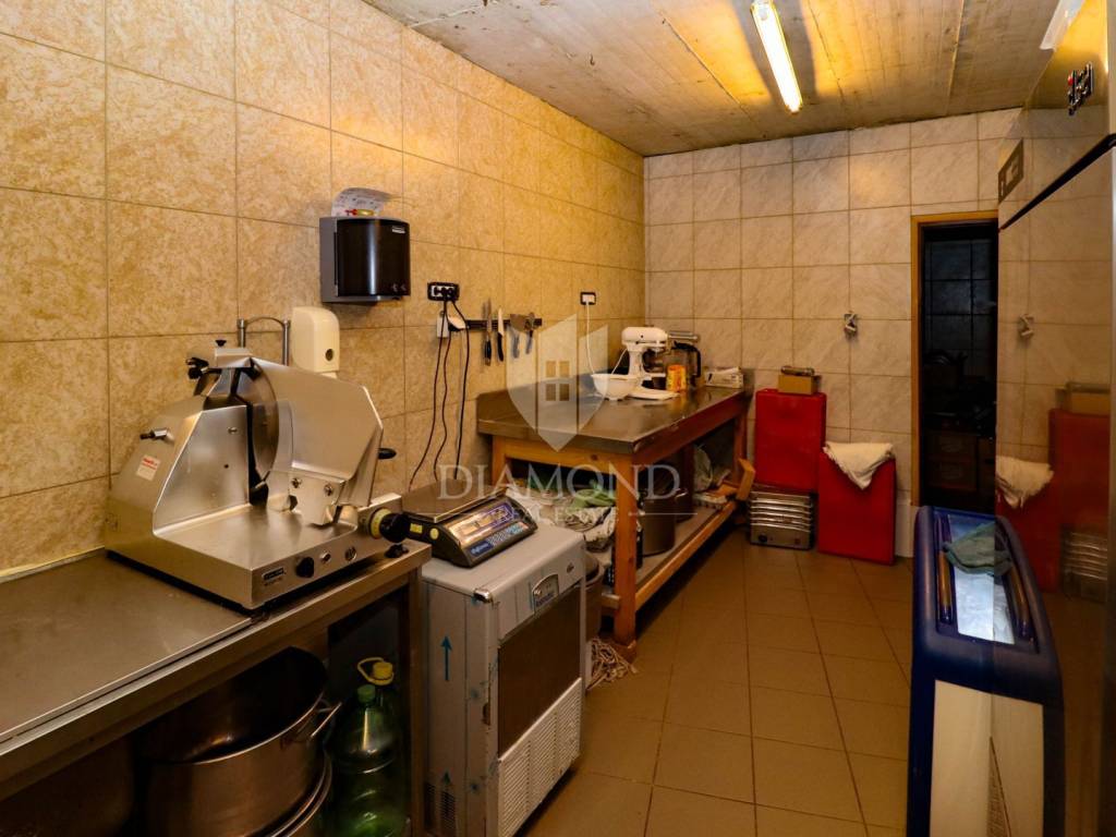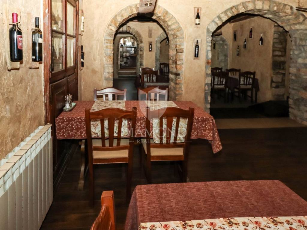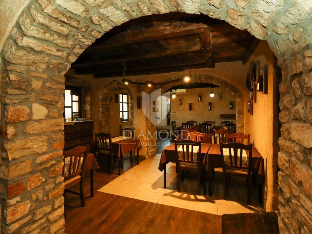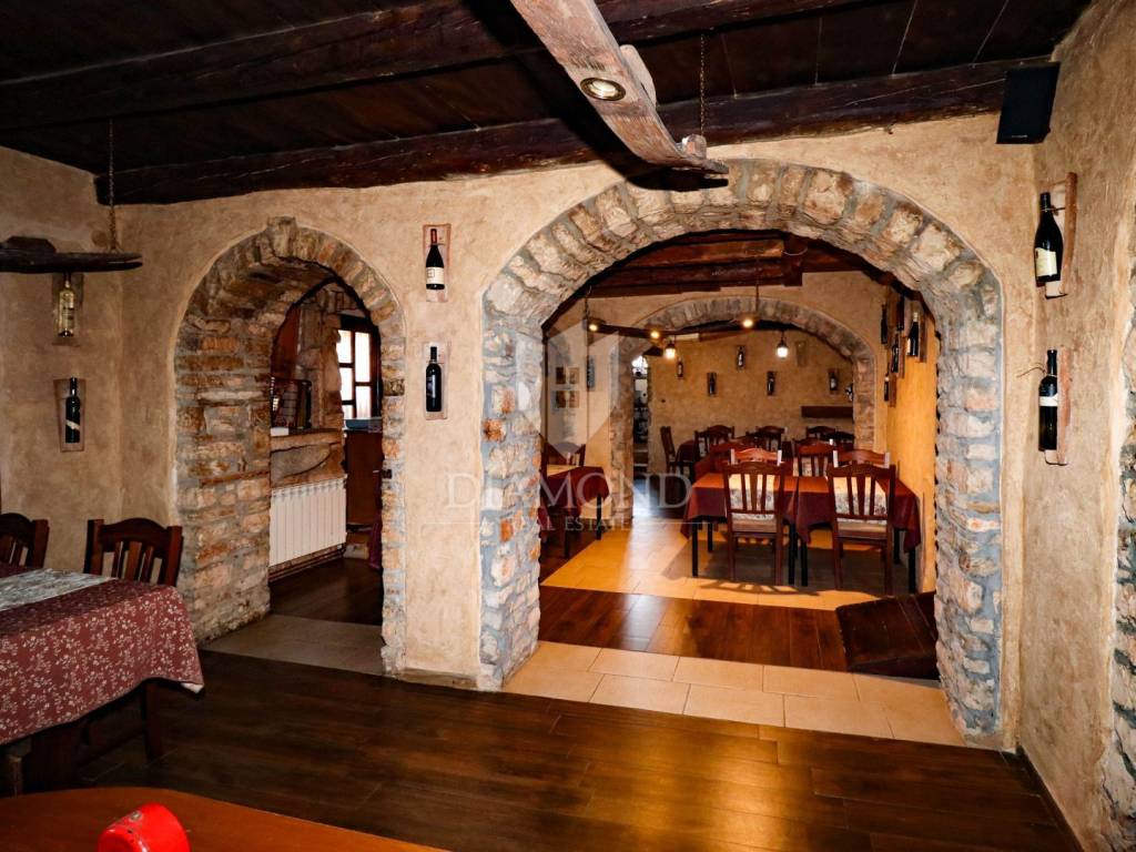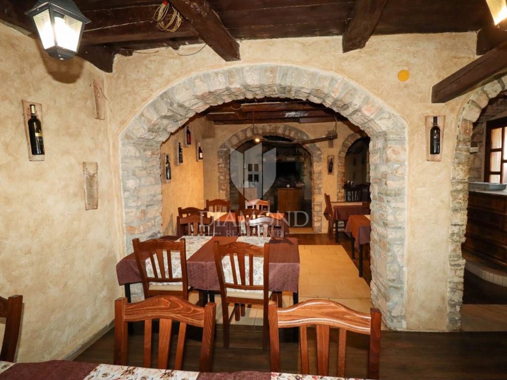 Konoba se sastoji od kuhinje sa skladištem i stražnjim ulazom za dostavu, šanka sa predprostorom, sanitarnim čvorom, unutarnje sale sa kaminom, prostrane unutarnje terase sa šankom, predivne vanjske terase uz koju se nalazi bazen sa sunčalištem. Sama lokacija nekretnine je na mirnom mjestu okružena sa prirodom.