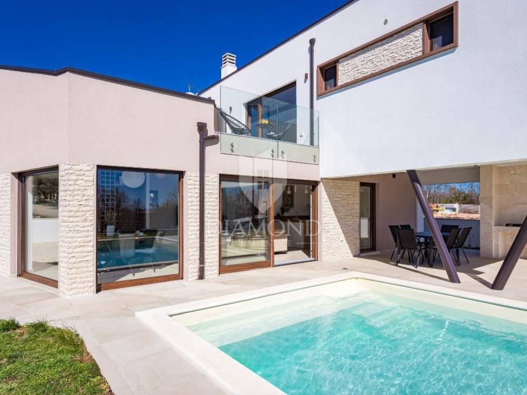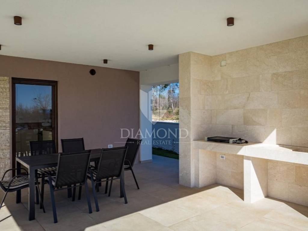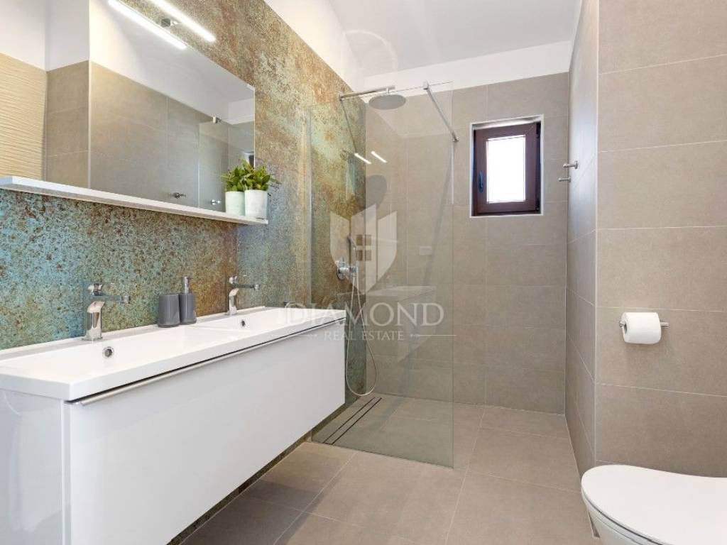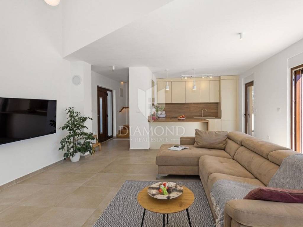 The ground floor consists of a spacious kitchen with a dining room, and a living room with a view of the pool and yard. The space is designed for enjoyment and socializing, and opens directly onto the terrace with the pool. There is also a bathroom on this floor, which further increases the practicality of the space. On the first floor there are two bedrooms, each with its own bathroom, which ensures maximum comfort and privacy. Each bedroom has its own terrace with an enchanting view of the sea, creating the perfect setting for morning rest or evening relaxation. In the yard there is a large swimming pool surrounded by a sunbathing area. Next to the pool is the summer kitchen, perfect for preparing meals outdoors and enjoying warm summer evenings.