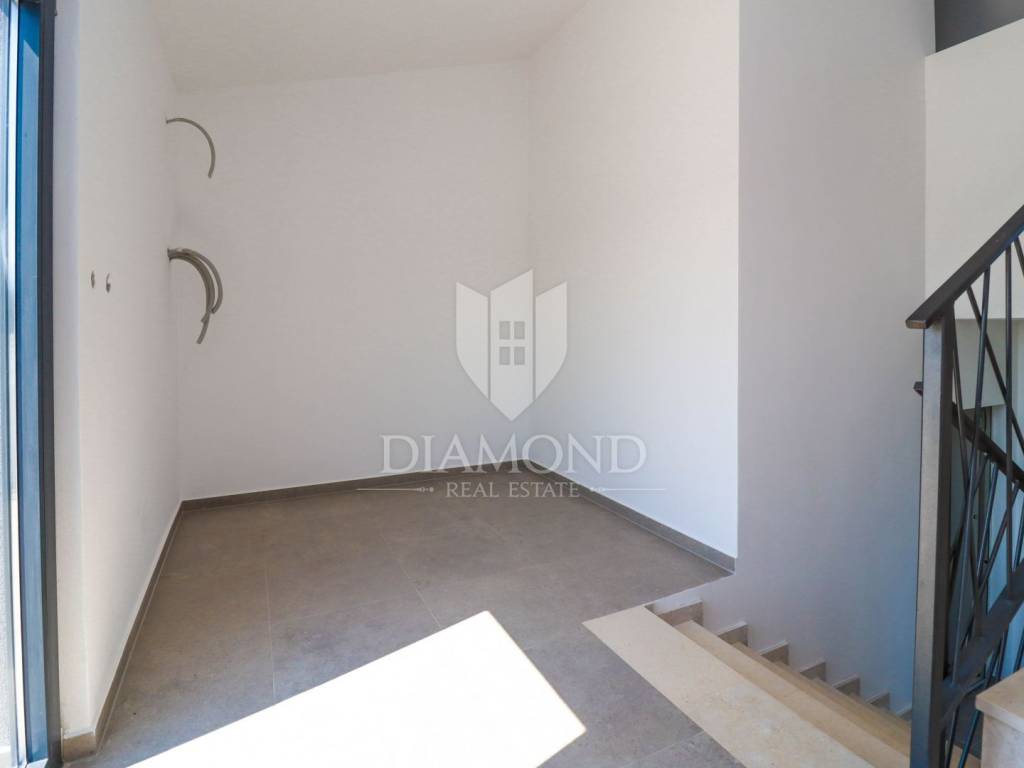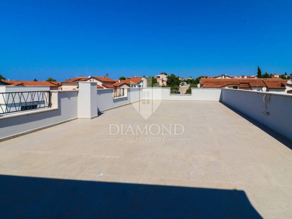 Poreč, surroundings, three-room apartment on the first floor with a roof terrace! In a quiet place on a fertile plateau 112 m above sea level with a view of the Alps and a place known for its olive oil, an apartment on the first floor with a roof terrace is for sale. Its total size is 94.70 m2 and consists of a living room, a dining room, an open space concept kitchen, three bedrooms, one bathroom, a toilet and two storage rooms. The apartment has a roof terrace of a total of 86 m2, which has preparations for a jacuzzi and a summer kitchen. The residential building has a total of four apartments, it is of modern construction. The entire apartment is heated with electricity as underfloor heating. Air conditioners are also installed, which are also used for cooling on hot days. All facilities for living are located in the place where the apartments are located. The first beaches are only 500 m away, while the center of Poreč and its beaches are only 10 km away. This property is an ideal opportunity for family life.