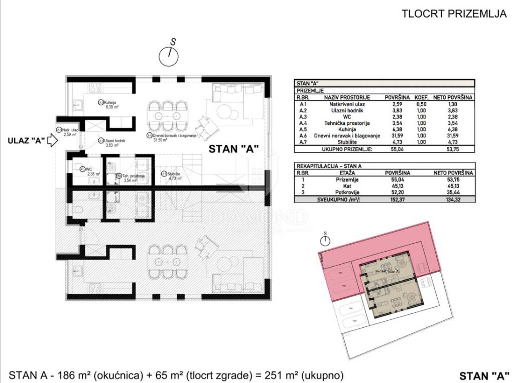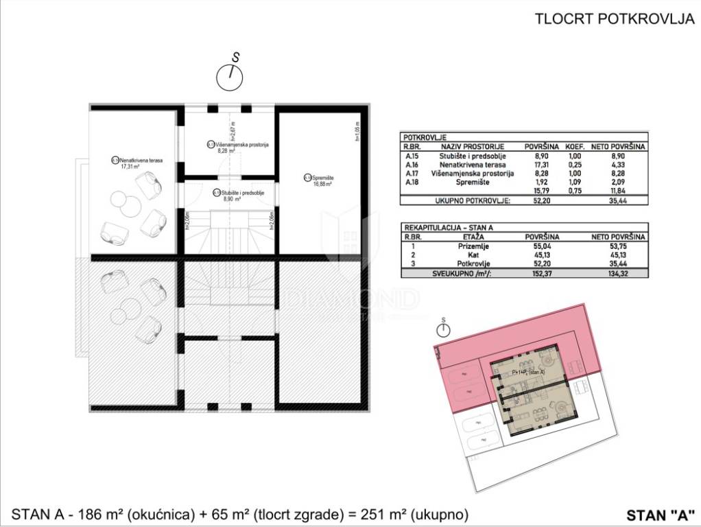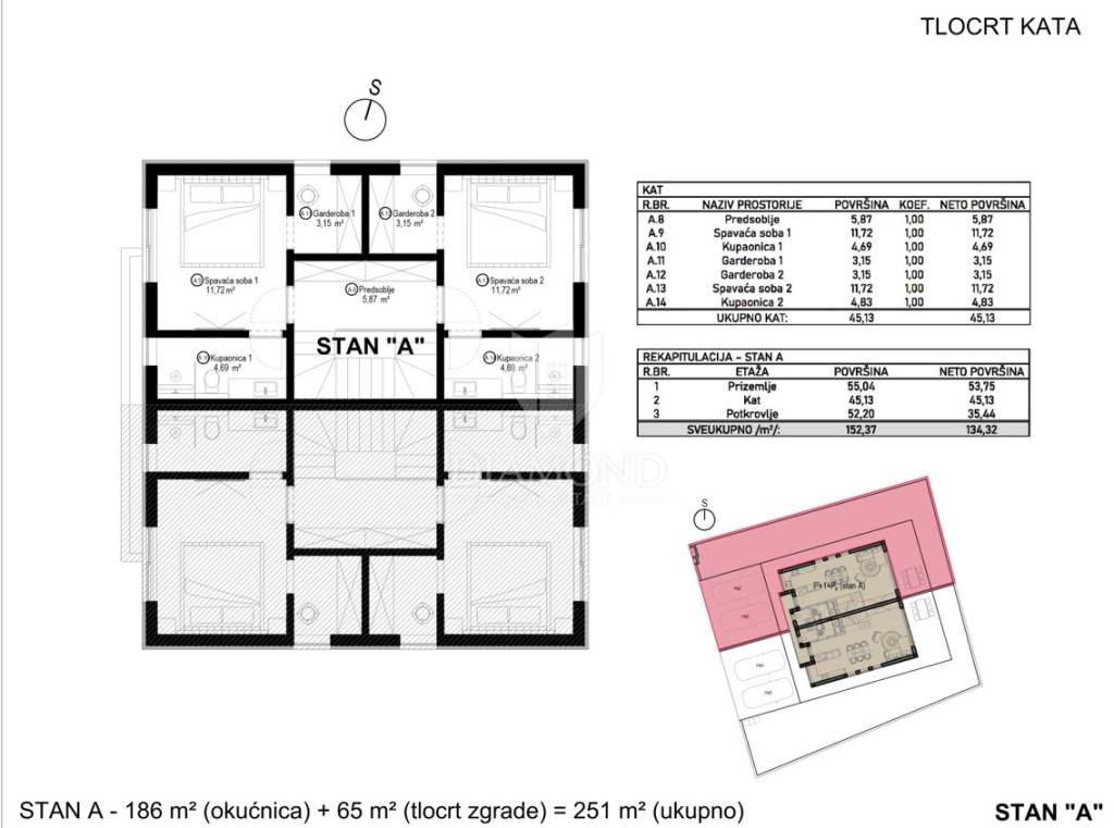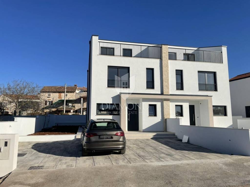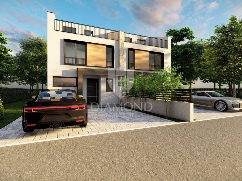Poreč area, modern semi-detached house with roof terrace and sea view under construction! This modern semi-detached house is located just a few minutes from the center of Poreč. Its total net area is 134.32 m2. The house extends over three floors. The ground floor of the house consists of a hallway, laundry/technical room, guest toilet, and the open concept living room is connected to the dining room and kitchen, creating a comfortable space for socializing and dining, while large glass surfaces provide plenty of natural light. We reach the second floor via an internal staircase, where there are two spacious bedrooms, each with its own wardrobe and bathroom. The second floor takes us to the roof terrace, which is definitely the highlight of this house. Here there is a preparation for a jacuzzi, which allows you to relax in warm baths while enjoying the beautiful view of the sea and the surrounding landscape. In addition, the terrace can be arranged for outdoor seating and dining, ideal for enjoying evenings under the stars or sunny mornings. On the third floor, there is also a multi-purpose room that can have different purposes. It can be used as a study or hobby room. Also, on this floor there is a storage room for storing various things and equipment. The heating of this modern house is provided by an air-water heat pump (split design) with electricity as the main source of energy (floor heating). This house on three floors with its spacious garden of 186 m2 and two secured parking spaces in front of the entrance to the house, located in a quiet area, yet close to all necessary amenities, provides comfort, functionality and luxury, offering its tenants a beautiful home with a view of the sea and everything you need for a comfortable and elegant life as well as an ideal investment for a tourist rental.