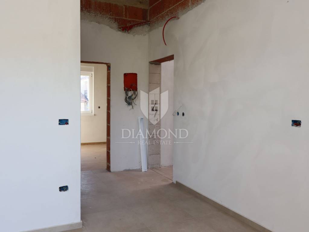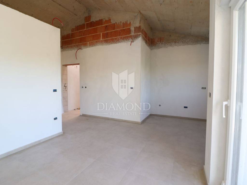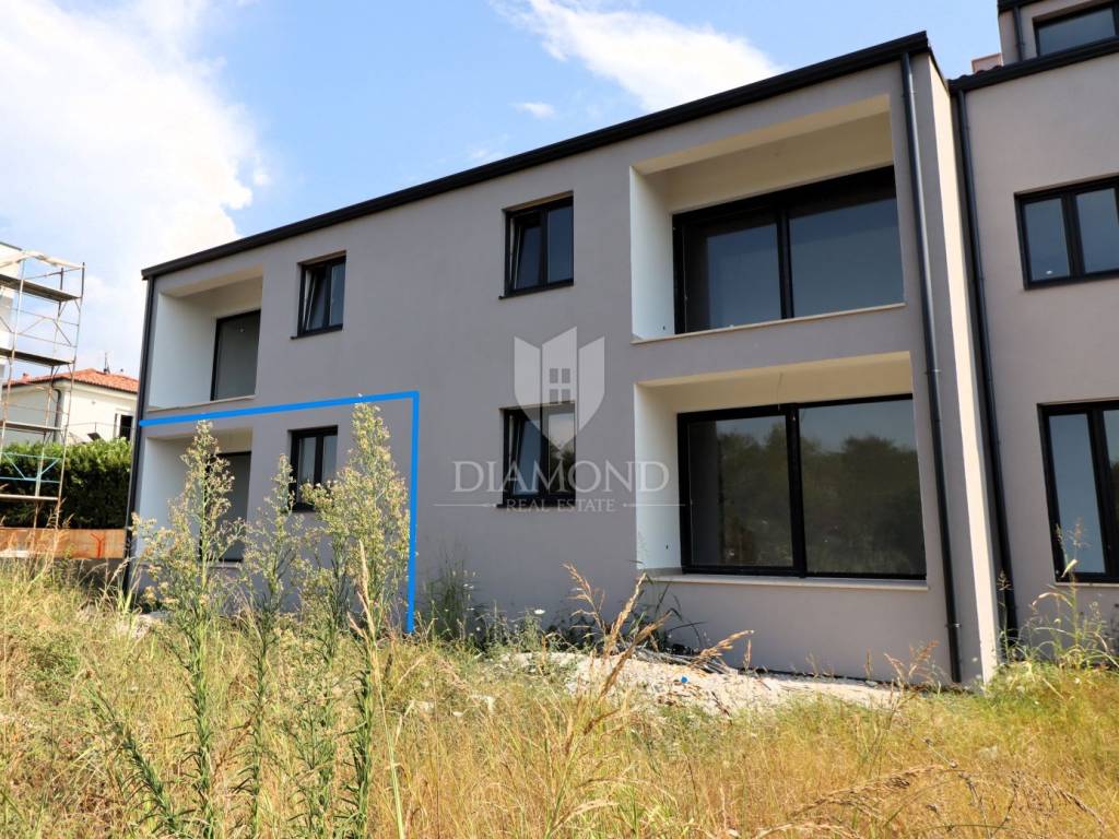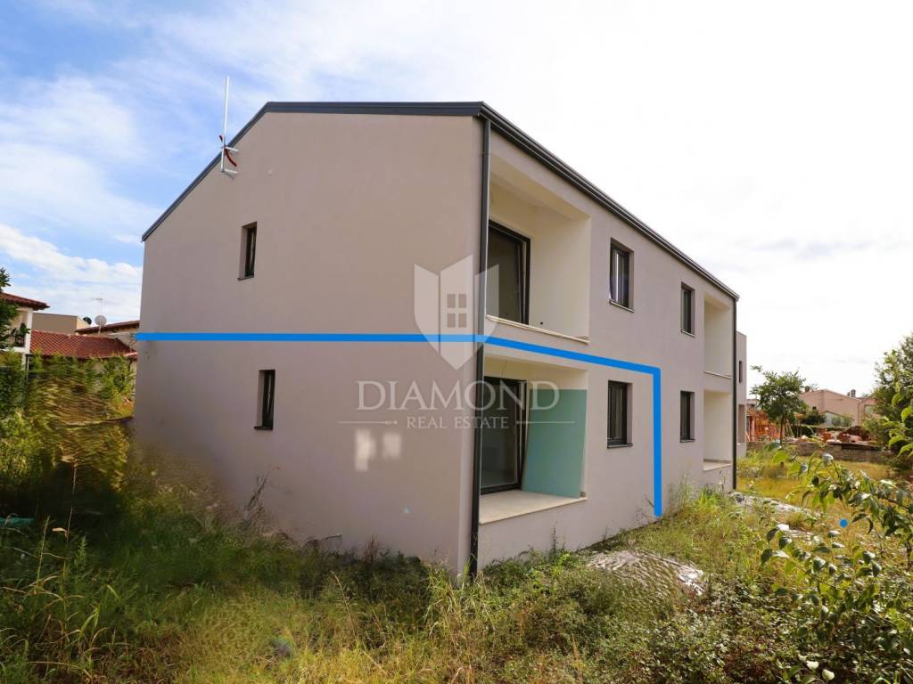 Apartment on the ground floor of a new building with a garden in the vicinity of Poreč In the vicinity of Poreč, this modern new building is completed in a building with only four residential units. The building is located only 6 km from the sea and the center of Poreč. For sale is a three-room apartment located on the ground floor of the building with a spacious garden. The apartment with its 52.85 m2 net area offers a bright space in which there is a living room with an open-concept dining room and kitchen, two bedrooms and a bathroom. From the living room there is a loggia of 4.28 m2 and a spacious garden that surrounds the entire apartment. The apartment is heated by underfloor heating with a heat pump and air conditioners for heating and cooling in every room. The apartment also has a parking space in front of the building. All the necessary and desirable content for life are located in the immediate vicinity. The planned completion of construction is in December 2024. The price of the property includes VAT.