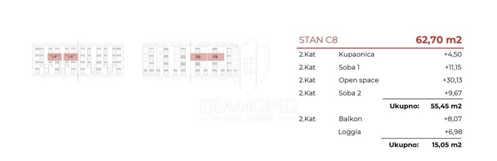 Located on the second floor, the apartment spans 62.70 m² and includes a bright and spacious living room connected to the kitchen and dining area, two comfortable bedrooms, and a modern bathroom. The property also comes with two parking spaces, offering added convenience for future owners. The balcony provides a stunning sea view, while the loggia overlooks peaceful greenery.