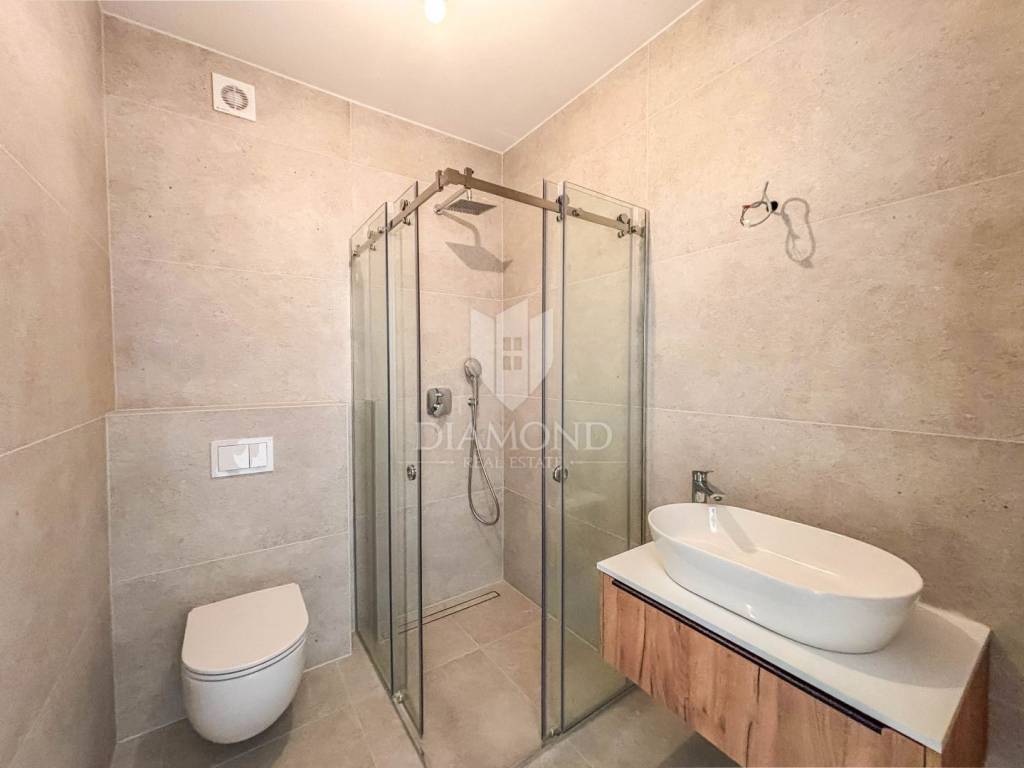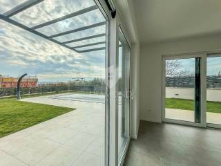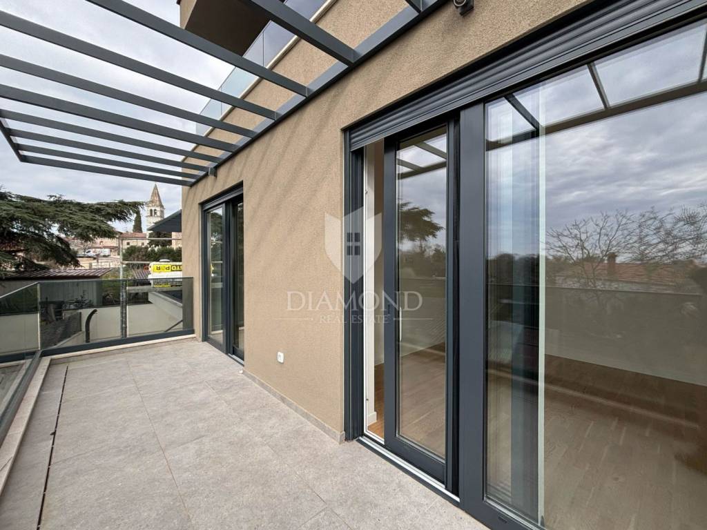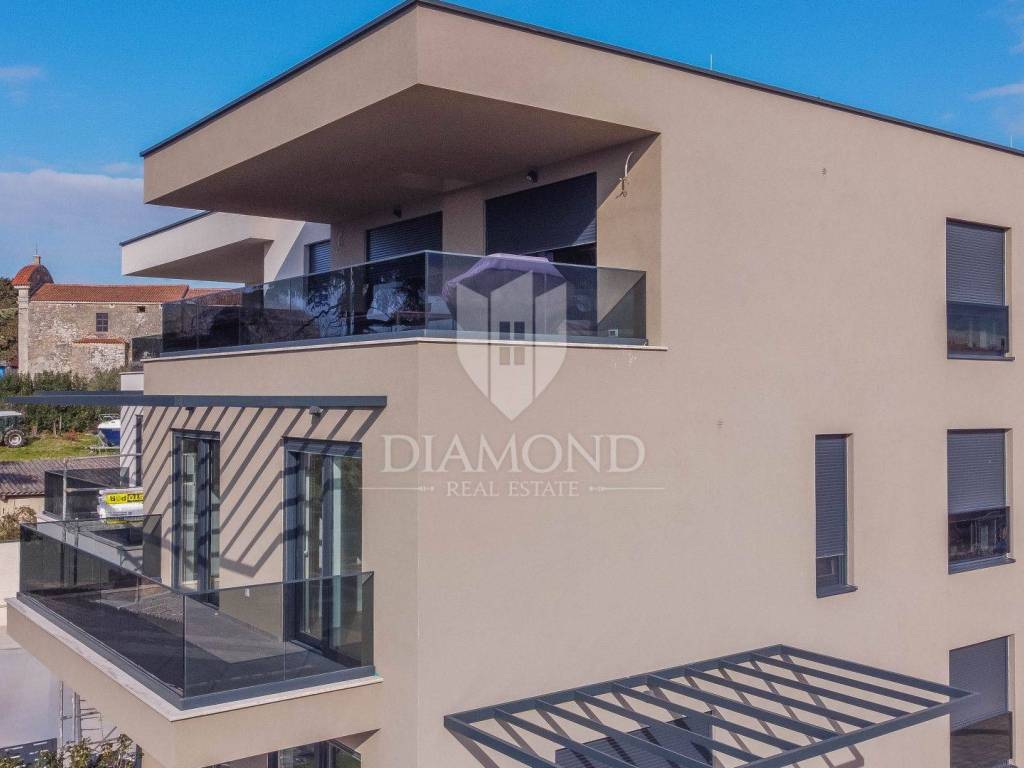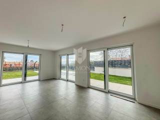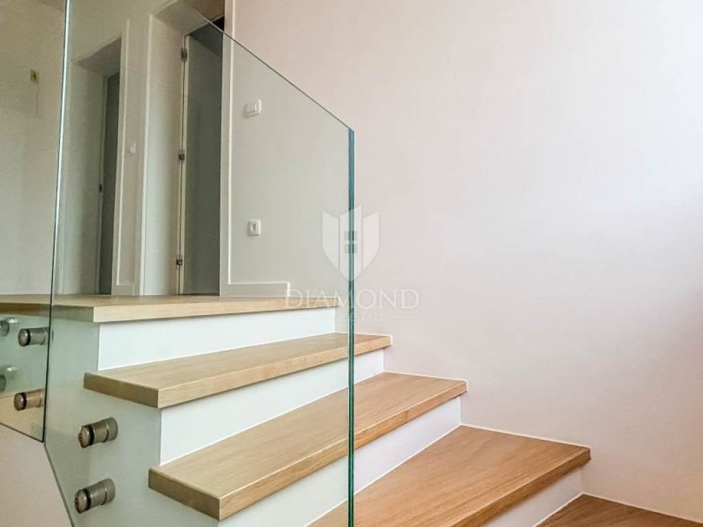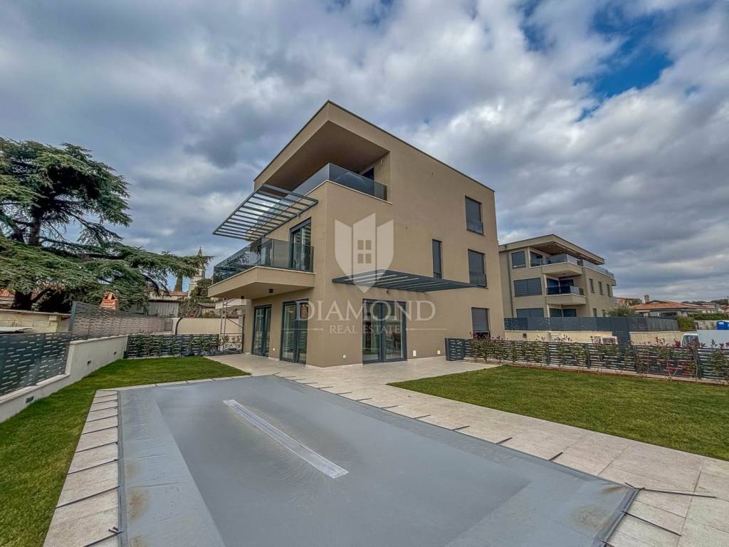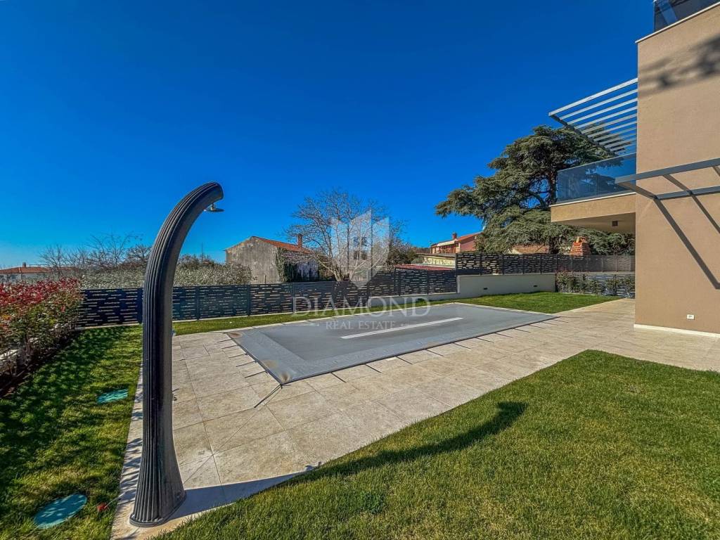 This luxury residential building with a total of four two-story apartments is located in a quiet place, only 3 km from the first beaches. The apartments are very spacious and spread over two floors. On the ground floor of the apartment there is a living room, dining room and kitchen according to the open space concept, one bedroom with its own bathroom and toilet, an elegant internal staircase leads to the first floor where there are two more comfortable bedrooms with their own well-furnished bathrooms and a common terrace that offers beautiful view of the sea. The living room leads to a covered terrace where there is also a swimming pool where you can enjoy it on hot summer days. The size of the pool is 17.50 m2, which is part of the apartment. The total size of the apartment is 157.64 m2. The apartment will be heated by underfloor heating with a heat pump and air conditioners. Poreč is located 9 km away from the town. All amenities from school, kindergarten, restaurants, bank, shop, post office, children's playgrounds, walks by the sea and in nature are located in the immediate vicinity of the apartment. The apartment is included in the VAT system, so the prices include VAT.