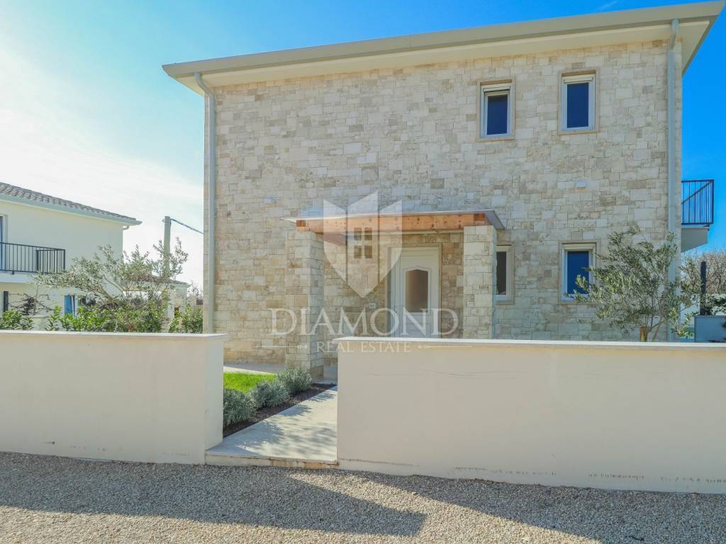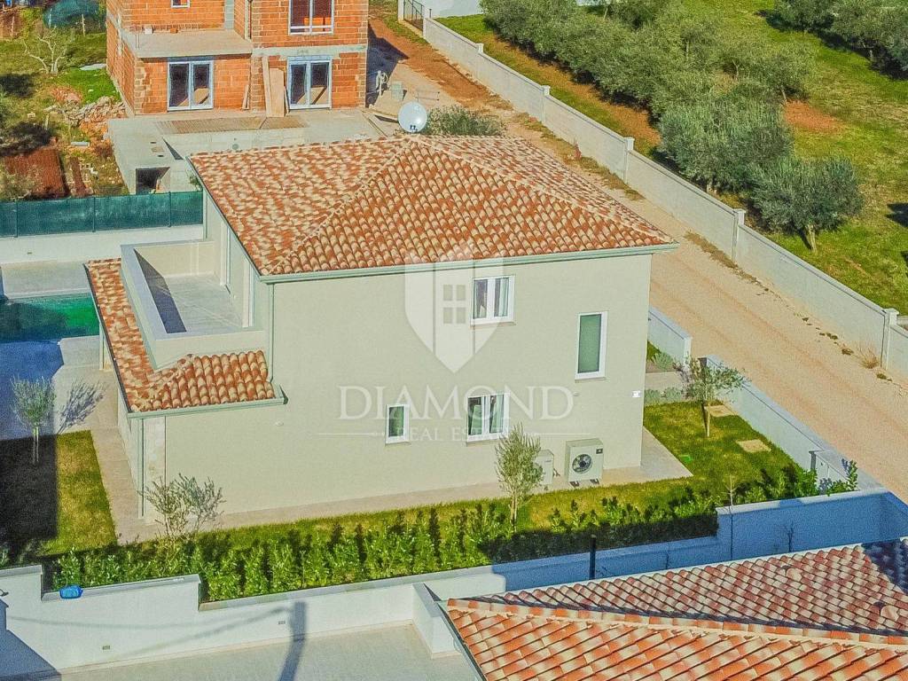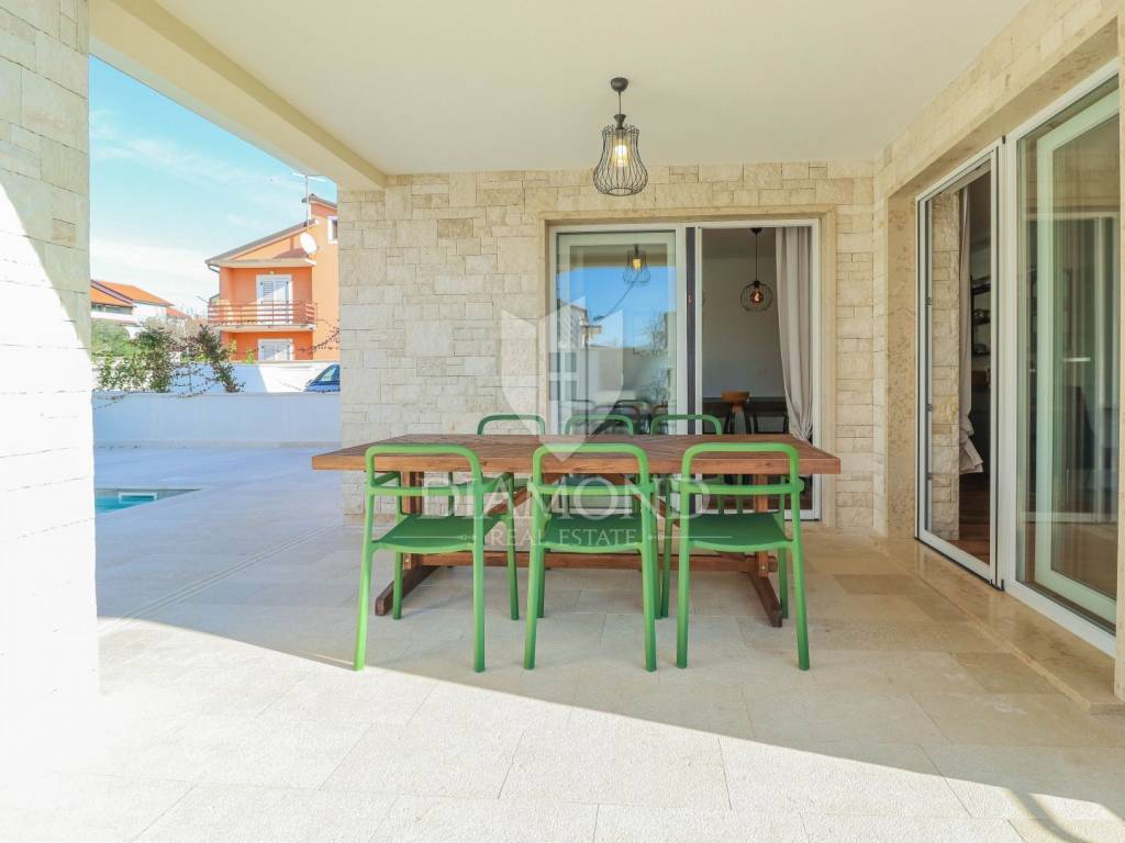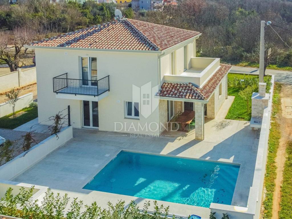 The house has a total area of 180m2, and extends over two floors. On the ground floor there is a living room with a kitchen and a dining room, 2 bedrooms each with their own separate bathrooms, a laundry room and a toilet. From the living room you can access the covered terrace, from which you can access the landscaped garden, barbecue, swimming pool and sunbathing area. On the first floor there is another space for socializing with access to the terrace, a bathroom and 3 bedrooms, one of which has its own bathroom and access to the terrace. Underfloor heating is electric and cooling is air conditioning. High-quality building materials and modern equipment were used in the construction of the house. The house is fully equipped and ready for use and is being sold as such.