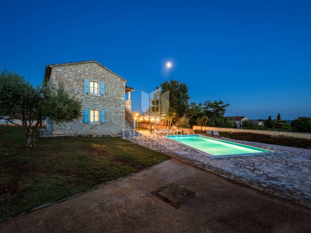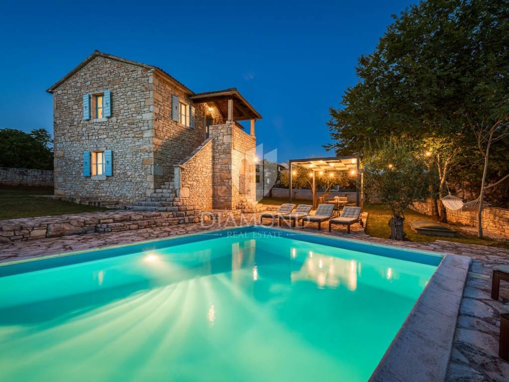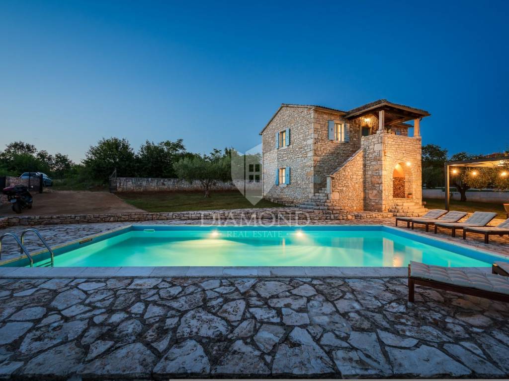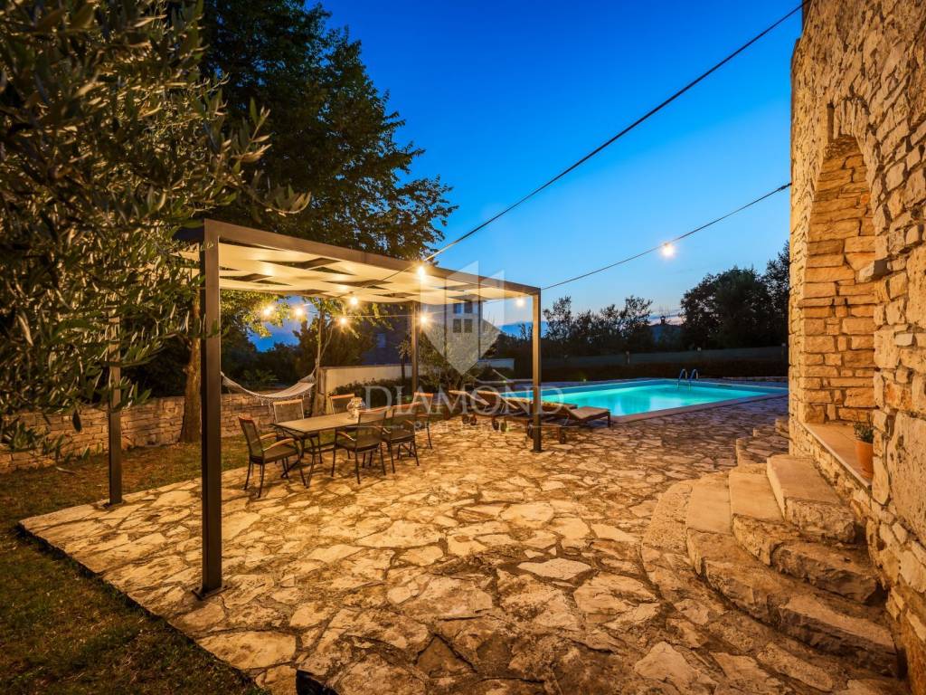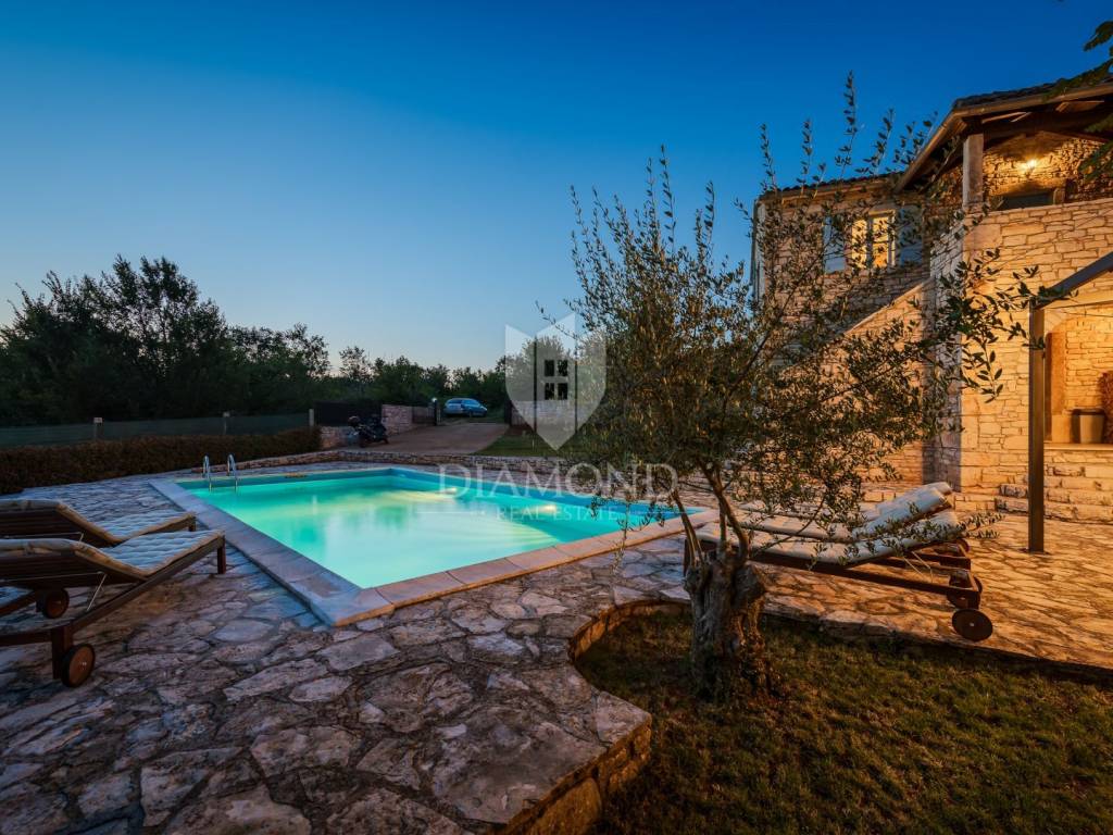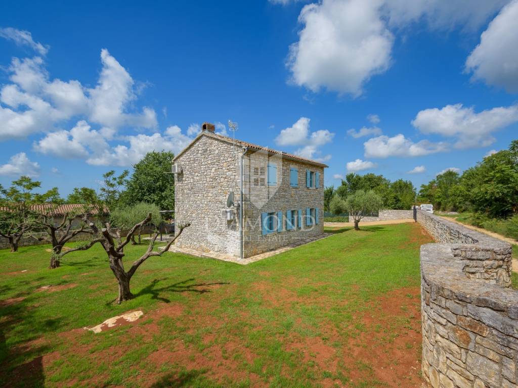 Istrian autochthonous stone house with swimming pool, near Poreč! This beautiful Istrian stone house with a swimming pool is for sale. The house is located in a quiet place only fifteen minutes from the city of Poreč. Located on a spacious plot of 969 m2, the house offers 110 m2 of net living space on two floors. On the ground floor of the house there is a living room, a kitchen with a dining area and a guest toilet. We climb the spiral stairs to the first floor of the house where there are three bedrooms and a bathroom. On the first floor there is also a terrace connected by external stairs. The terrace offers a beautiful view of the surrounding landscape and the sea in the background. In the living room there is a wood-burning stove that creates a very pleasant and warm atmosphere on cold winter days. In addition, two new air conditioners for heating and cooling were installed in the house, one on each floor of the house. In the spacious fenced yard of the house, there is a swimming pool of size 11x5 meters, ideal for refreshing in the summer months. In the continuation of the yard next to the pool, there is a pergola for relaxing and staying in the shade on hot summer days. There is enough parking space for two cars in the yard of the house. Behind the house there is also a shed for wood and a storage room for garden maintenance tools. This charming stone house, located only a few minutes from all the necessary facilities for life, is a unique opportunity for family life as well as for investment in a tourist rental.