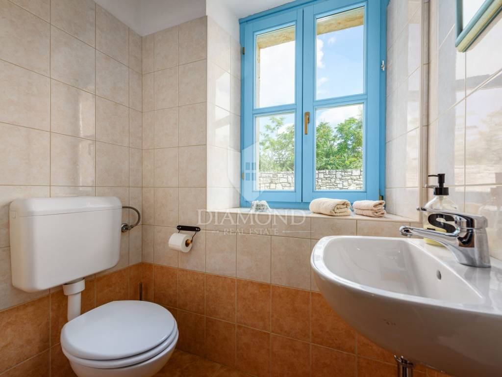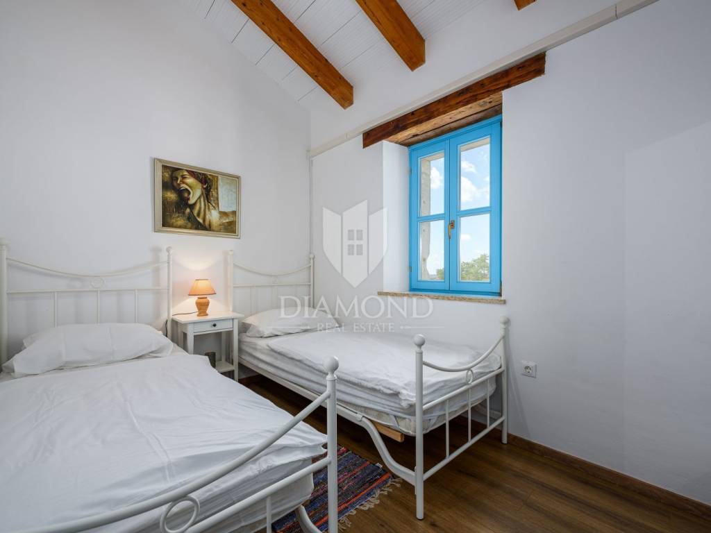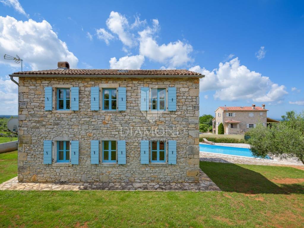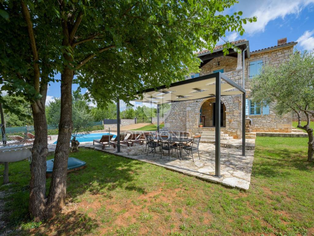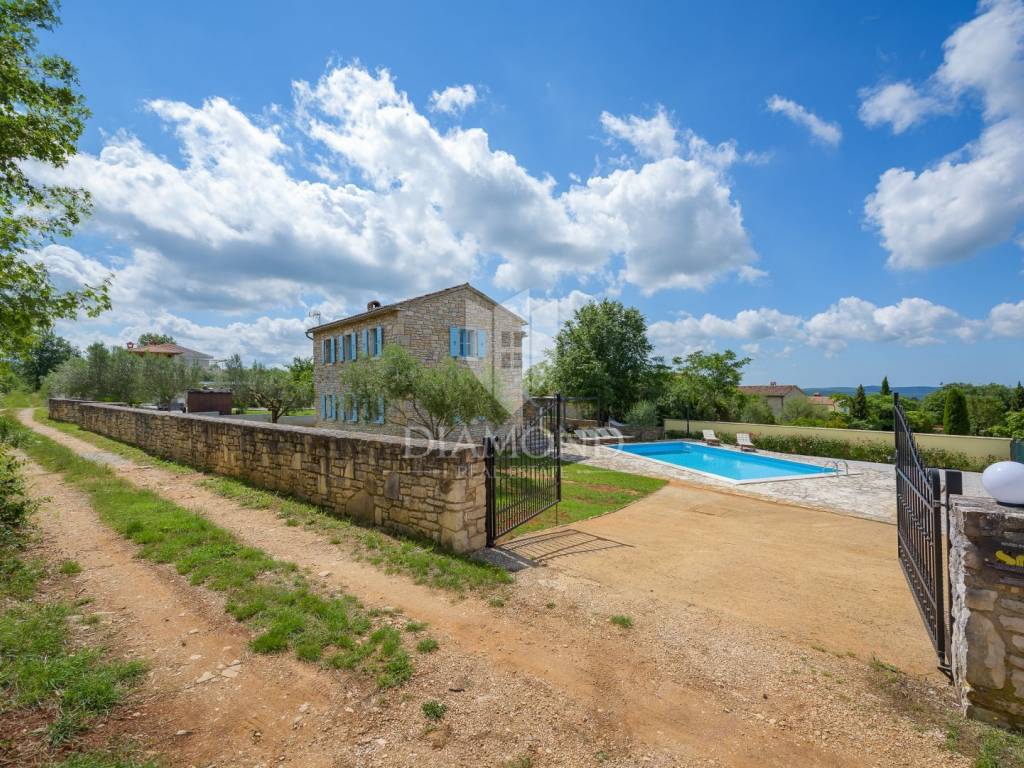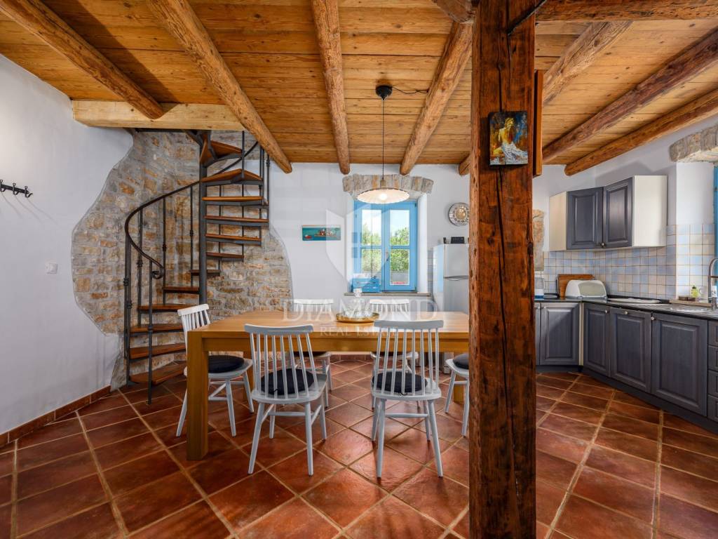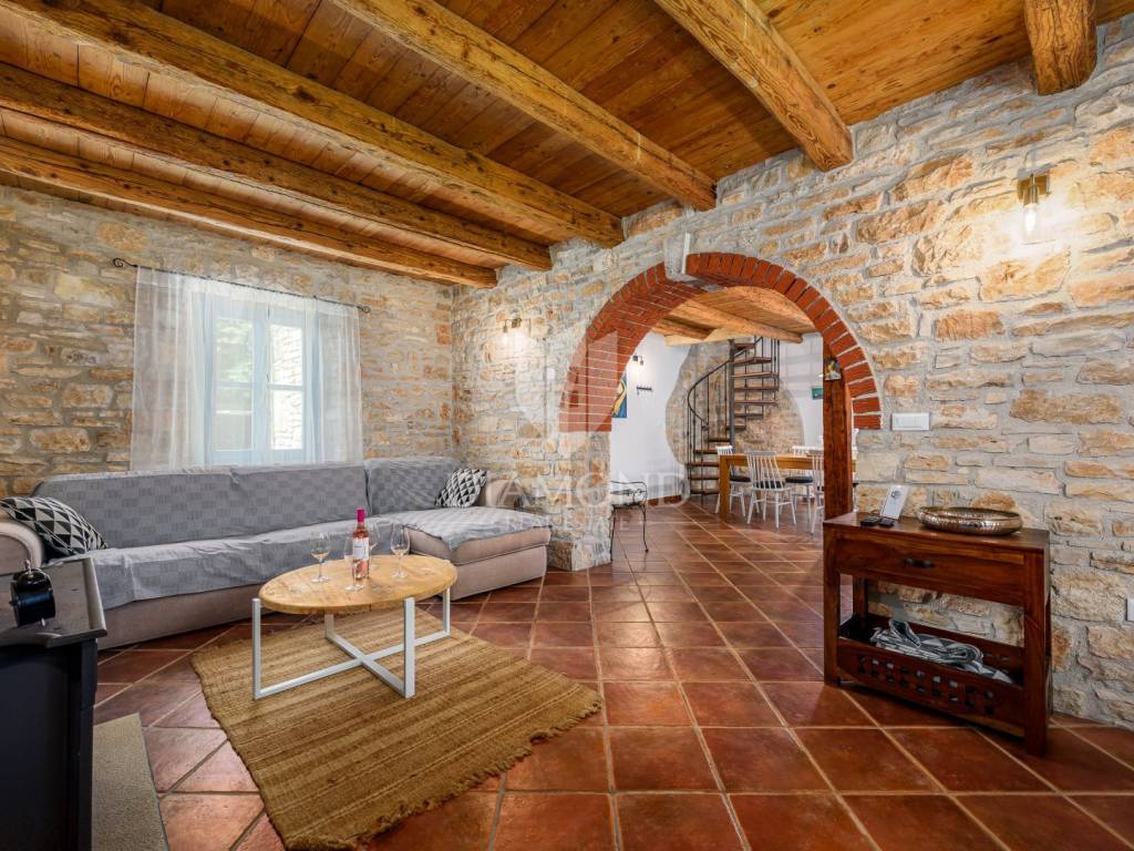 Istrian autochthonous stone house with swimming pool, near Poreč! This beautiful Istrian stone house with a swimming pool is for sale. The house is located in a quiet place only fifteen minutes from the city of Poreč. Located on a spacious plot of 969 m2, the house offers 110 m2 of net living space on two floors. On the ground floor of the house there is a living room, a kitchen with a dining area and a guest toilet. We climb the spiral stairs to the first floor of the house where there are three bedrooms and a bathroom. On the first floor there is also a terrace connected by external stairs. The terrace offers a beautiful view of the surrounding landscape and the sea in the background. In the living room there is a wood-burning stove that creates a very pleasant and warm atmosphere on cold winter days. In addition, two new air conditioners for heating and cooling were installed in the house, one on each floor of the house. In the spacious fenced yard of the house, there is a swimming pool of size 11x5 meters, ideal for refreshing in the summer months. In the continuation of the yard next to the pool, there is a pergola for relaxing and staying in the shade on hot summer days. There is enough parking space for two cars in the yard of the house. Behind the house there is also a shed for wood and a storage room for garden maintenance tools. This charming stone house, located only a few minutes from all the necessary facilities for life, is a unique opportunity for family life as well as for investment in a tourist rental.