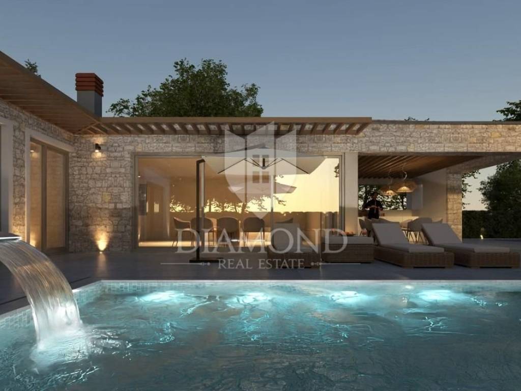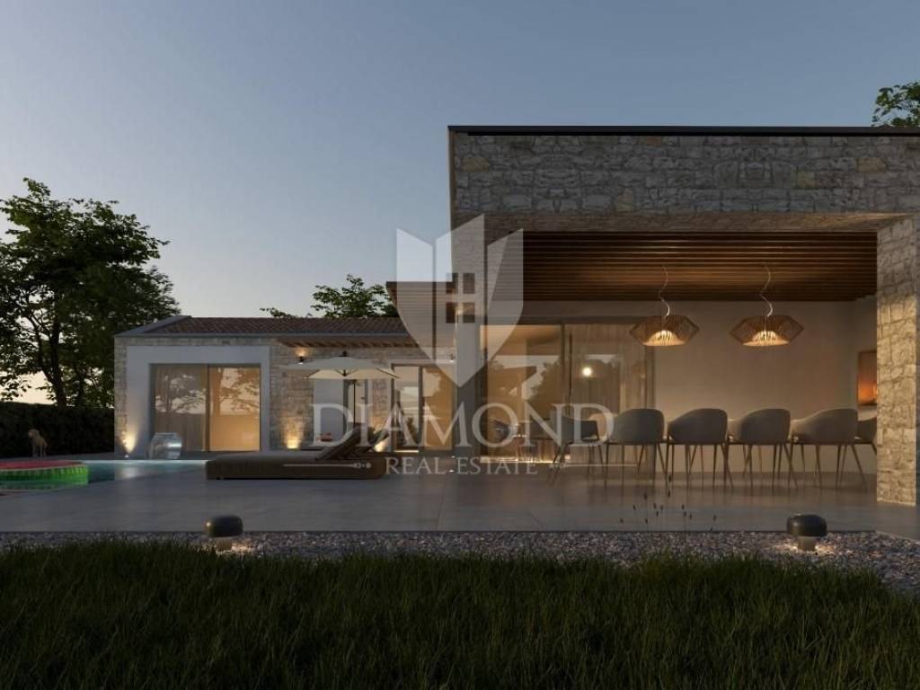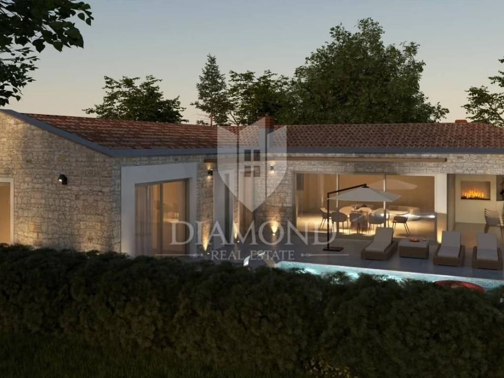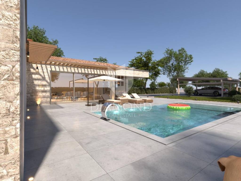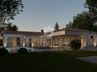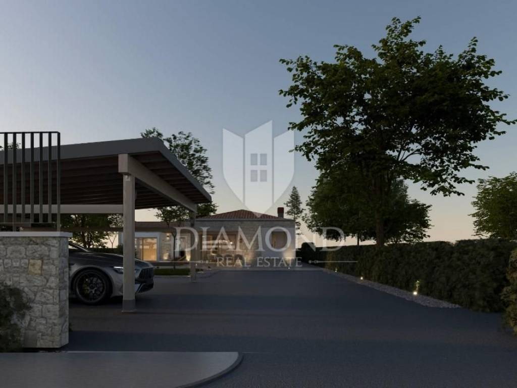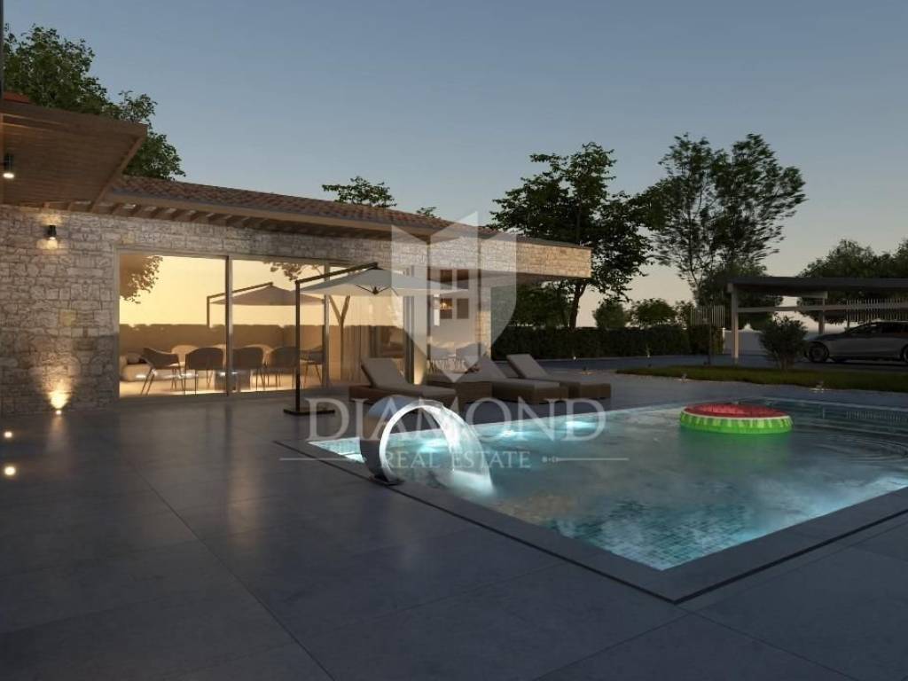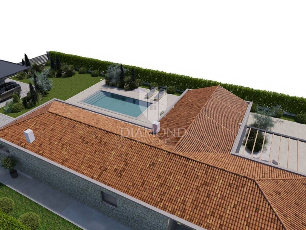 Modern single-storey house under construction with a swimming pool in a quiet environment near Poreč In the vicinity of Poreč, in a small village on the very edge of the settlement, this modern holiday home is located. The house is surrounded by luxurious villas and holiday homes. The house consists of a large, open living area with a dining room and kitchen, 3 comfortable bedrooms with en-suite bathrooms, a guest toilet and a storage room. Large glass walls provide access to a spacious garden of 1032 m², which includes two terraces, a swimming pool with a sundeck and parking for four cars. The house was designed with an emphasis on comfort and energy savings, with underfloor heating using a heat pump, two chimneys for an indoor and outdoor fireplace, as well as above-average ceiling heights with slopes that add to the space and elegance. Technically equipped as a smart home, it includes an alarm system, video surveillance, electric shutters, and the equipment is of a high standard. The furniture can be arranged according to the buyer's wishes. Construction is scheduled for completion in summer/autumn 2025, and the property is built with top-quality materials that allow for easy maintenance, reduced costs and high tourist rental income. This luxury home is ideal for those who want to enjoy a peaceful environment with top-notch amenities, while being close to Poreč and its coast!