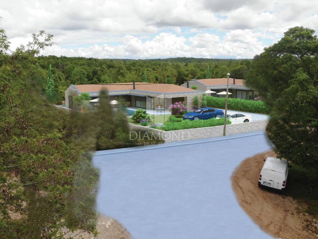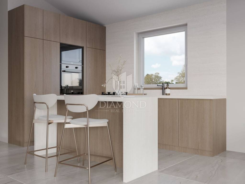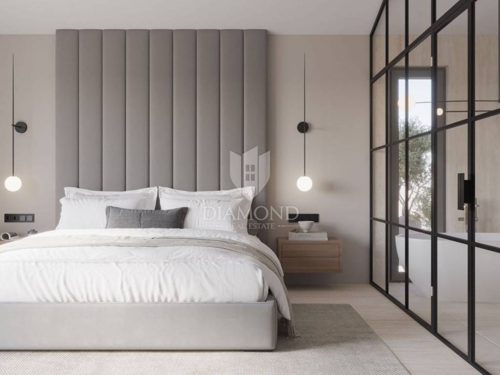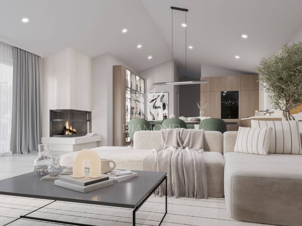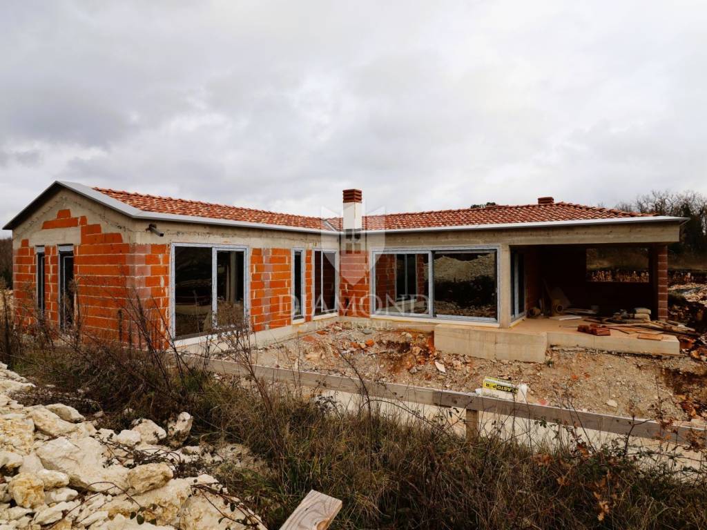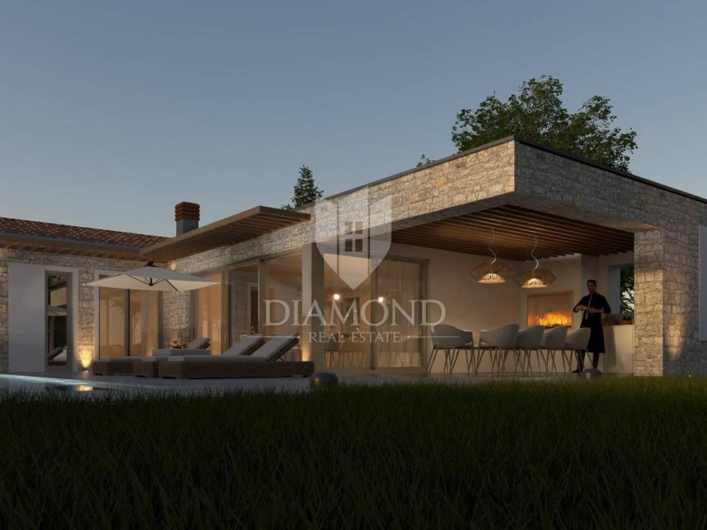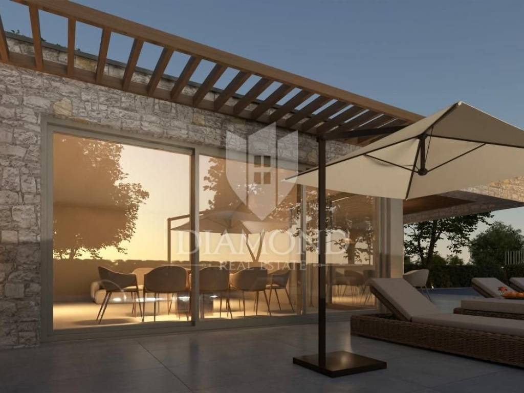 Modern single-storey house under construction with a swimming pool in a quiet environment near Poreč In the vicinity of Poreč, in a small village on the very edge of the settlement, this modern holiday home is located. The house is surrounded by luxurious villas and holiday homes. The house consists of a large, open living area with a dining room and kitchen, 3 comfortable bedrooms with en-suite bathrooms, a guest toilet and a storage room. Large glass walls provide access to a spacious garden of 1032 m², which includes two terraces, a swimming pool with a sundeck and parking for four cars. The house was designed with an emphasis on comfort and energy savings, with underfloor heating using a heat pump, two chimneys for an indoor and outdoor fireplace, as well as above-average ceiling heights with slopes that add to the space and elegance. Technically equipped as a smart home, it includes an alarm system, video surveillance, electric shutters, and the equipment is of a high standard. The furniture can be arranged according to the buyer's wishes. Construction is scheduled for completion in summer/autumn 2025, and the property is built with top-quality materials that allow for easy maintenance, reduced costs and high tourist rental income. This luxury home is ideal for those who want to enjoy a peaceful environment with top-notch amenities, while being close to Poreč and its coast!