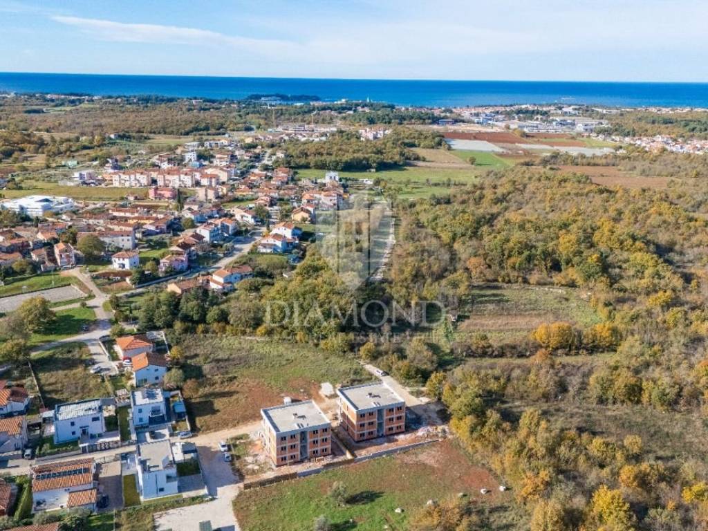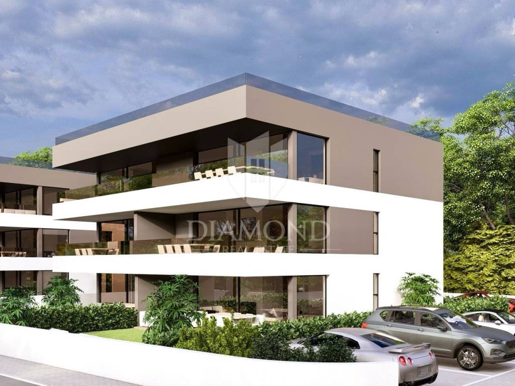This modern penthouse under construction is for sale just two kilometers from the center of Poreč. On its 153.35 m2 net area of the apartment, there is a spacious living room with dining room and kitchen, four bedrooms, two bathrooms, a toilet, a utility room and a laundry room. The master bedroom has its own bathroom and dressing room. From the living room, a glass wall with shades as long as 6 meters allows access to a covered terrace measuring 36 m2. The apartment also has a 190 m2 roof terrace with a jacuzzi. The apartment also has four parking spaces in front of the building. The apartment will have an inverter air conditioner in every room and floor heating on a heat pump with installed thermostats in every room. High-quality Italian ceramics of larger profiles will be placed on the floors. Aluminum carpentry with three-layer glass and electric shutter lifters.