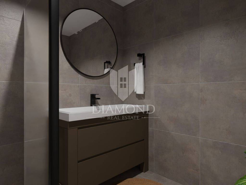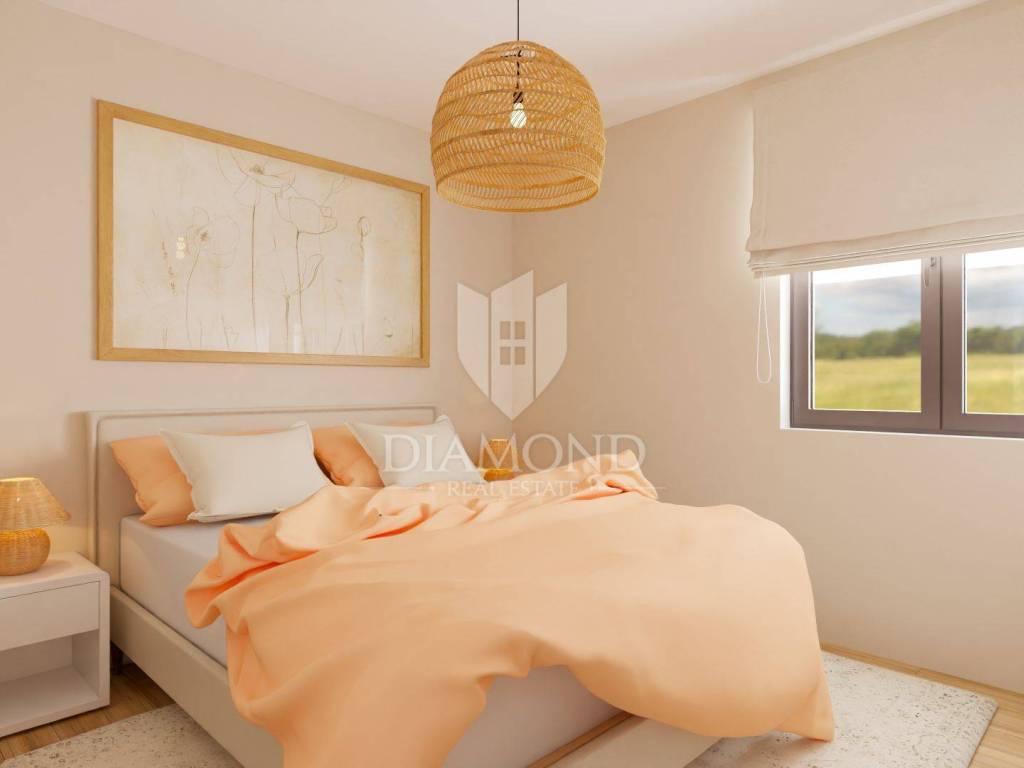 Poreč, surroundings, comfortable apartment on the first floor not far from the sea! Not far from the town of Poreč, only 8 km away, is this modern residential building with a total of 23 apartments. The apartment is located on the first floor and has a total of 73.16 m2. It consists of a hallway, living room, dining room and kitchen in an open space concept, two bedrooms, bathroom, utility room on the ground floor and parking. The net area of the apartment is 68.84 m2. The living room and bedroom have direct access to the terrace. The apartment will be heated by high-quality air conditioning and underfloor heating in the bathroom. The building has an elevator. Parking is located right in front of the building. The first beaches are only 800 meters away or a few minutes by bike. All amenities for life from shops, restaurants, tourist camps, post office are located in the immediate vicinity of the building. The planned completion of construction is summer 2025. Due to its ideal location and facilities, this property is an ideal investment for both family life and tourist rental.