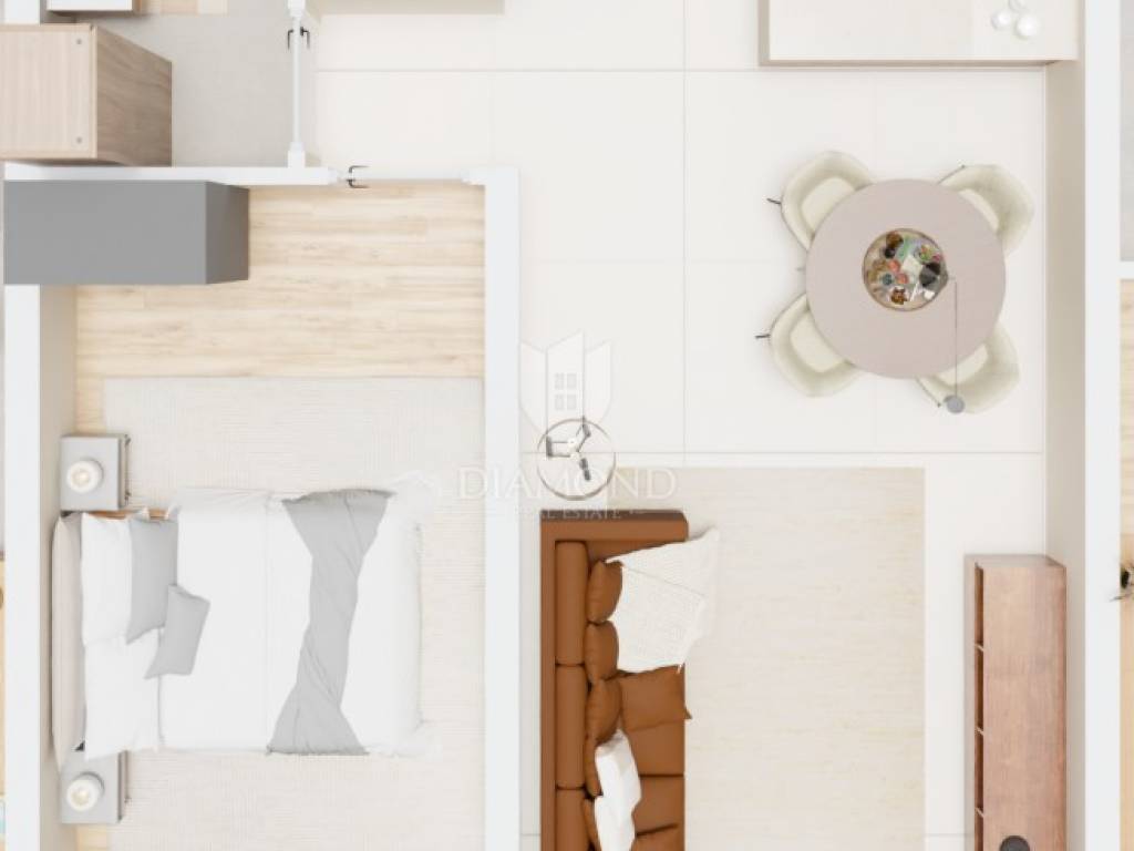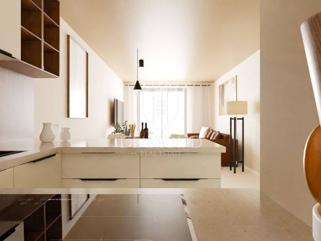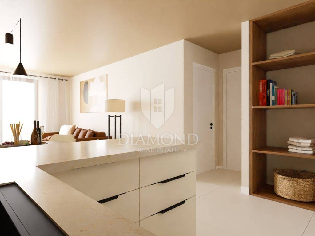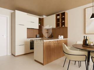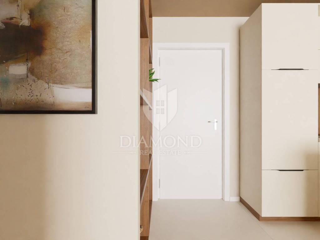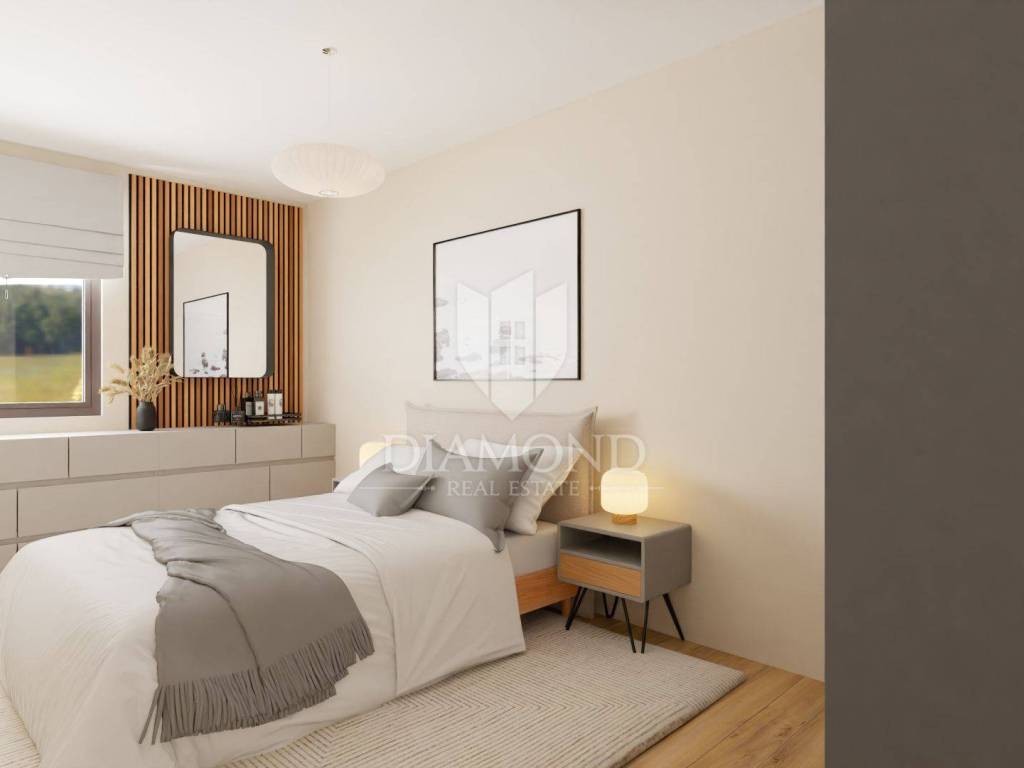 This modern residential building with a total of 23 apartments will be located not far from the city of Poreč, only 8 km away. The apartment is located on the second floor and has a total of 52.56 m2. It consists of a hallway, living room, dining room, open space kitchen, one bedroom, bathroom, storage room on the ground floor and parking. The living room leads directly to the terrace. The total net size of the apartment is 48.54 m2. The apartment will be heated by a quality air conditioner and underfloor heating in the bathroom. The building will have an elevator. The parking lot is right in front of the building. The first beaches are only 200 m away or a few minutes by bike. All amenities for life from shops, restaurants, tourist camps, post office are located in the immediate vicinity of the building. The planned completion of construction is summer 2025. Due to its ideal location and contents, this property is an ideal investment for tourist rental.
