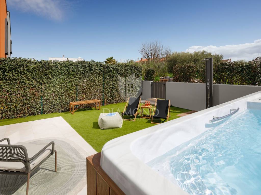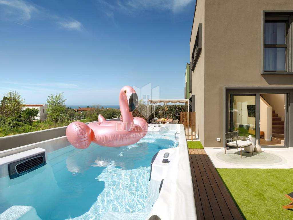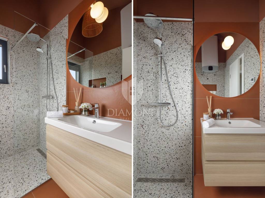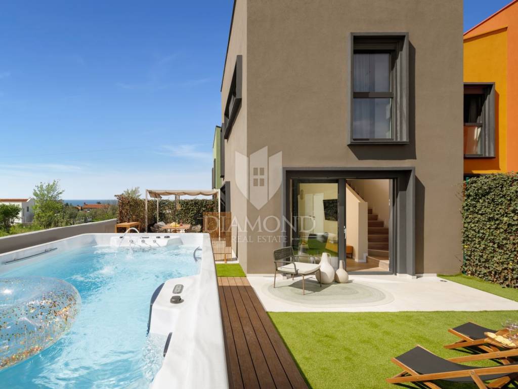 In a quiet area near the town of Poreč and just a few minutes from the sea, there is this modern terraced house that combines comfort, functionality and an attractive location. Located in the immediate vicinity of all the amenities needed for everyday life, this property offers ideal conditions for family living, but also an excellent opportunity for a tourist investment. The house extends over three floors – basement, ground floor and first floor – and is designed to provide maximum utilization of each space. The basement is fully furnished and equipped with natural light, which gives it a pleasant atmosphere and full functionality. It is currently used as an additional bedroom, play area, bathroom and laundry room, which further increases the residential value of the property. On the ground floor there is an airy living area connected to the kitchen and dining room in an open concept, and large glass walls allow plenty of daylight and direct access to the landscaped 100 m² yard with a swimming pool – perfect for enjoying warm days and relaxed evenings. On the first floor there are two bedrooms and a modern bathroom, with carefully selected materials and details. The house is being sold fully furnished, with a carefully coordinated interior that combines contemporary style with the warmth of home. The landscaped private yard offers plenty of space for socializing, relaxing or family activities outdoors. Thanks to its excellent location and quality workmanship, this property is a perfect match for those looking for their home by the sea, but also a safe investment with great potential in tourist rental.