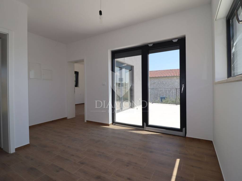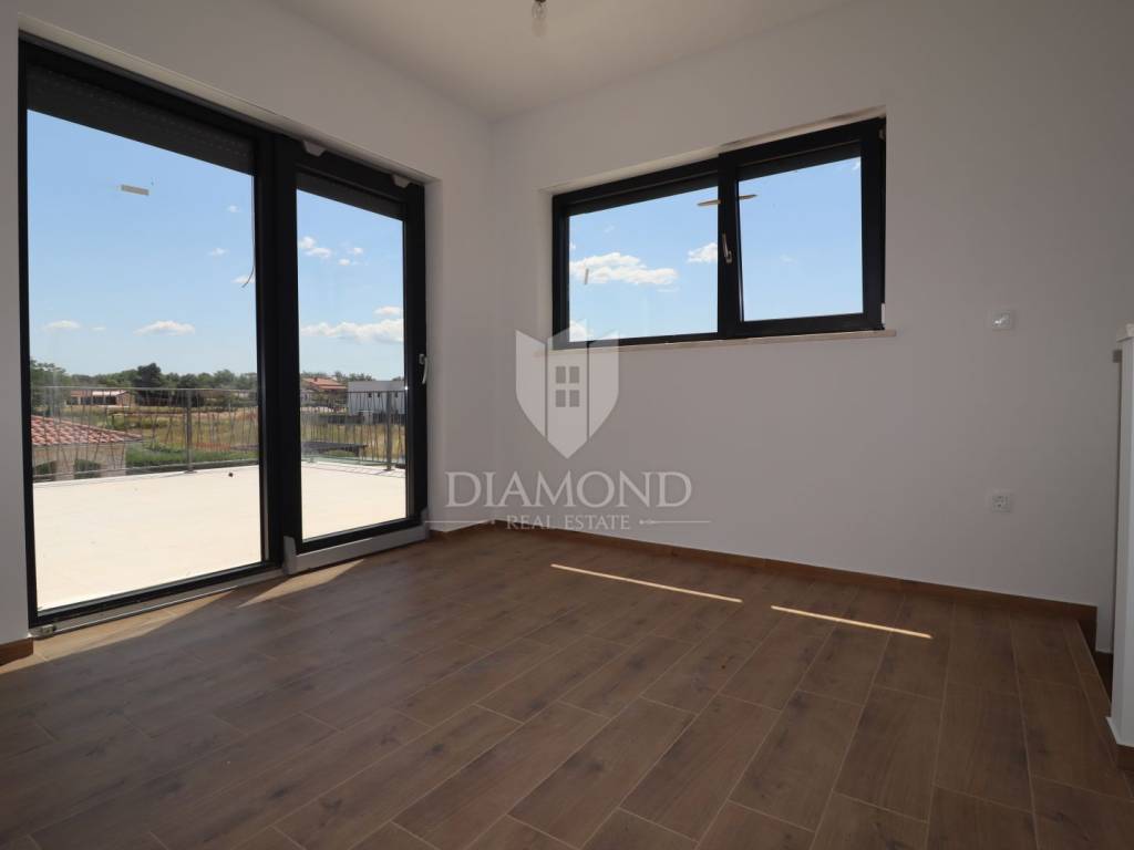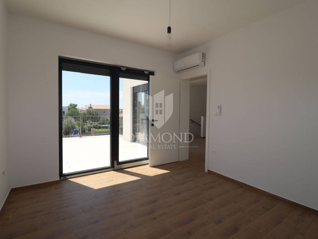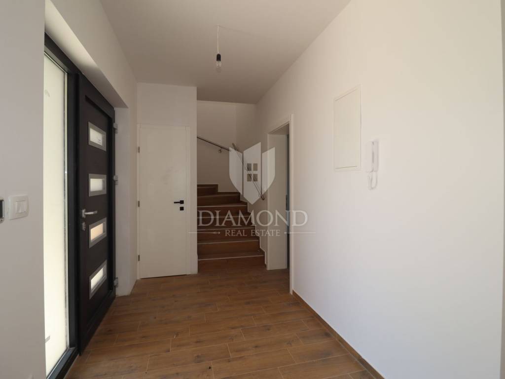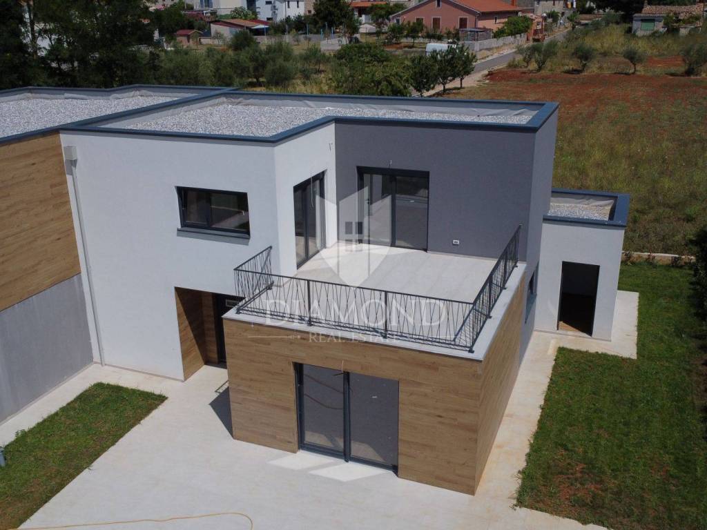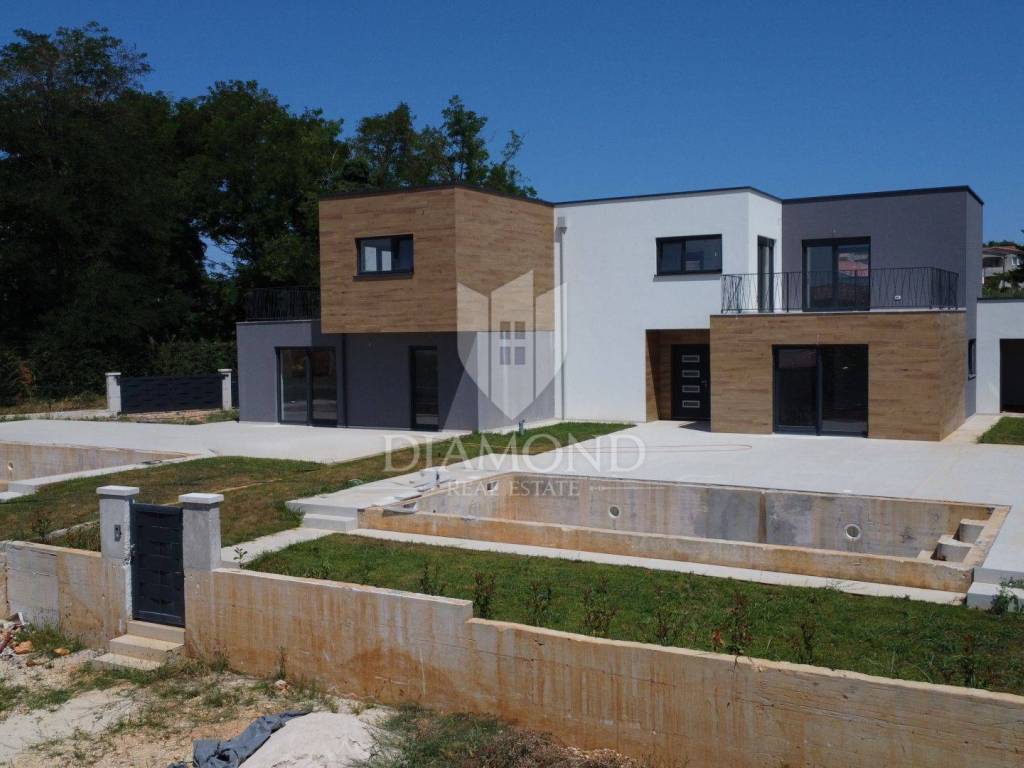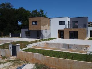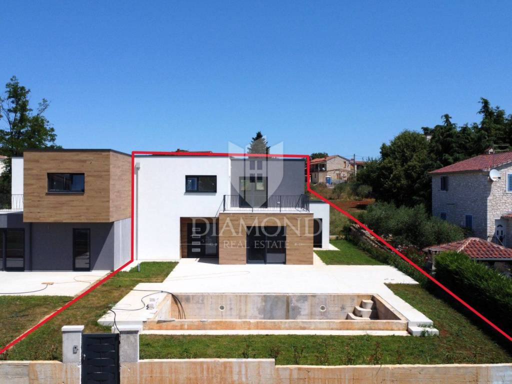 Poreč area, Modern semi-detached house with swimming pool We offer an attractive new construction of a modern semi-detached house with a total area of 138 m², located on a plot of 611 m². It is located in a quiet location with an open view of nature, while the sea in the background can be seen from the first floor, which makes it an excellent opportunity for living or investing in a tourist rental. The house extends over two floors – ground floor and first floor – and has a large landscaped garden with a swimming pool. The ground floor has a spacious living room with kitchen and dining room, one bedroom, bathroom, storage room and terrace with access to the sun deck and pool. On the upper floor there are two more bedrooms, two bathrooms and a large terrace with a view of the surrounding landscape and the sea in the background. The house is equipped with air conditioning for heating and cooling, and thanks to its southwest orientation, the space is abundant in natural light throughout the day. The property represents an ideal opportunity for family life, but also an excellent potential for tourist rental with the possibility of generating additional income. For more information or to arrange a viewing – feel free to contact us!