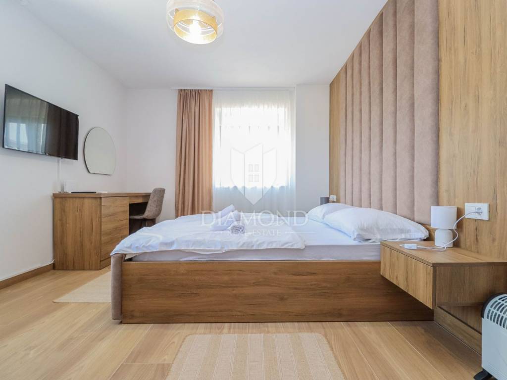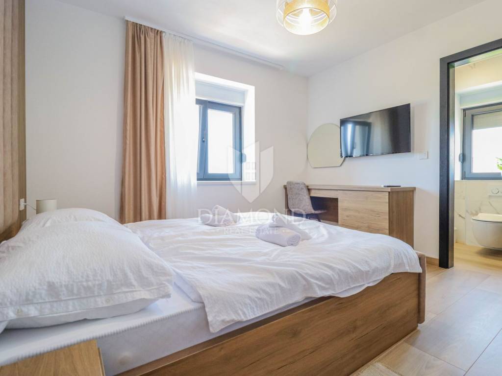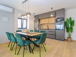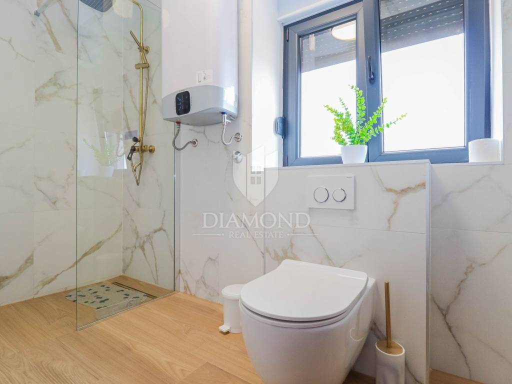 On the ground floor there is a spacious living room with an open-plan dining room and kitchen, a guest toilet and a practical storage room. The living room opens onto a beautifully decorated garden that provides additional space for enjoying the outdoors. On the first floor there are two bedrooms, each with its own bathroom, while on the second floor there are two more bedrooms and two bathrooms. When decorating the house, special attention was paid to details, which achieved a harmonious blend of functionality and aesthetics, with a dose of modern charm. All bathrooms, as well as the living room and kitchen, have underfloor heating, while the bedrooms are equipped with air conditioning units that ensure a pleasant temperature throughout the year. Each room has its own air conditioning unit, ensuring efficient heating and cooling.