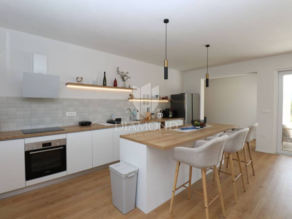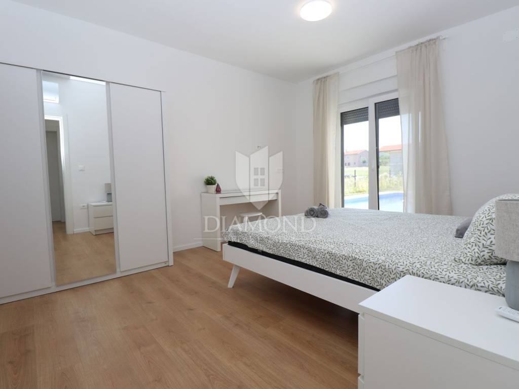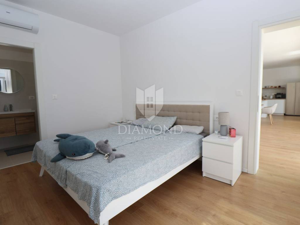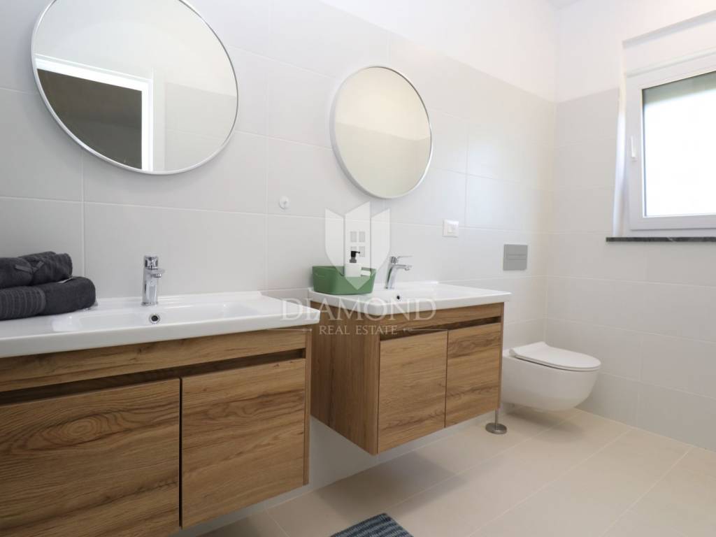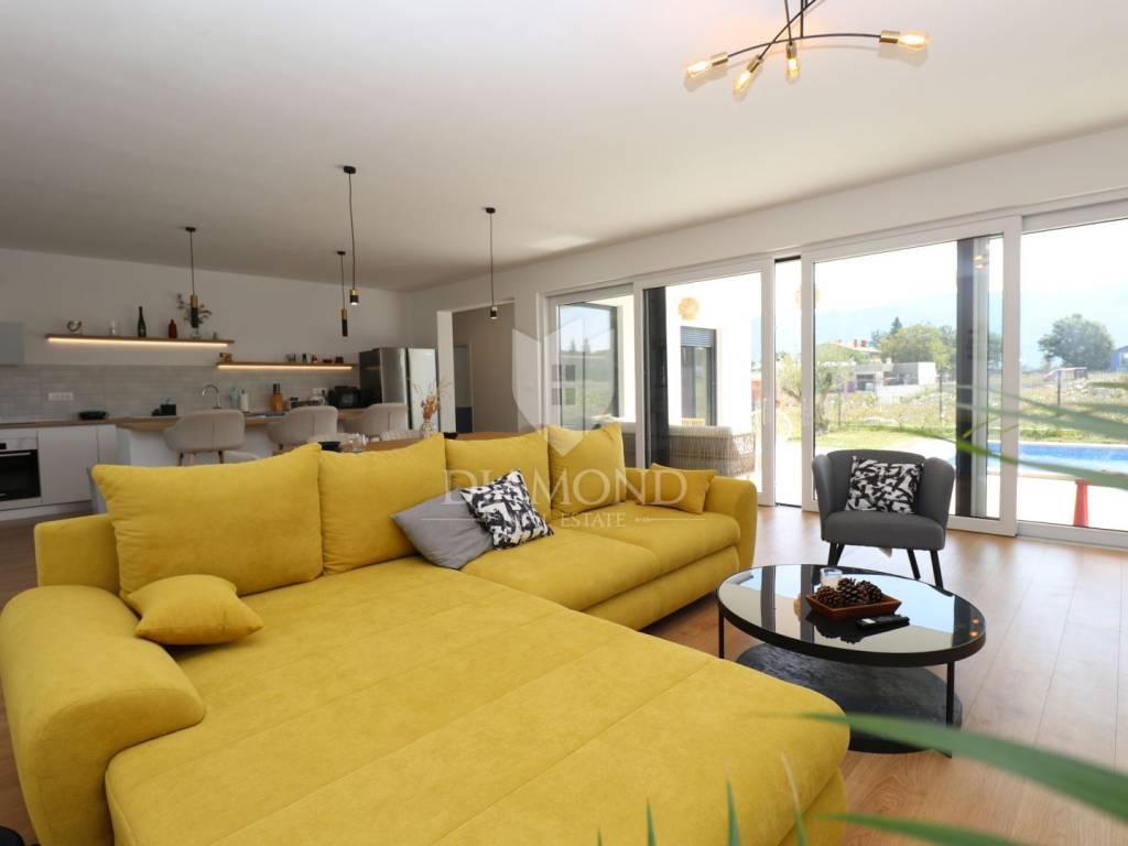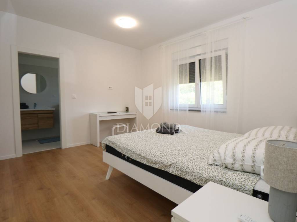 Labin, surroundings, new building with swimming pool surrounded by nature We are selling a modern new building located in a quiet neighborhood, ideal for a family oasis. This modern house offers the perfect combination of comfort and privacy, spread over a floor plan of 190 m², located on a spacious plot of 970 m². The interior of the house is designed with special attention to detail. The house contains three spacious bedrooms, each with its own modern bathroom, providing maximum comfort and privacy. An additional guest toilet is practically located for the comfort of your visitors. The central part of the house consists of an open space kitchen, which is connected to a spacious and bright living room. This space is perfect for family gatherings and entertainment, thanks to the large glass surfaces that provide plenty of natural light and a beautiful view of the garden. The outdoor area of this property is a true oasis of peace, ideal for relaxing and enjoying the outdoors. A special charm is provided by the heated pool, which allows swimming and recreation throughout the year. This house is built from the highest quality materials, with special emphasis on energy efficiency and durability. All bathrooms and the living room are equipped with underfloor heating, which provides additional comfort during the colder months, but also with air conditioners, which provides an optimal temperature throughout the year. The location in a quiet neighborhood provides privacy and security, and at the same time it is close to all the necessary facilities such as shops, schools and sports facilities. In addition to all these benefits, the house also has a spacious terrace, perfect for summer evenings and gatherings with family and friends. The private parking allows parking of several vehicles, which further adds to the practicality of this property. This exceptional property offers everything you need for a luxurious and comfortable life. For more information and to arrange a viewing, please contact us. Your new dream home is waiting for you!
