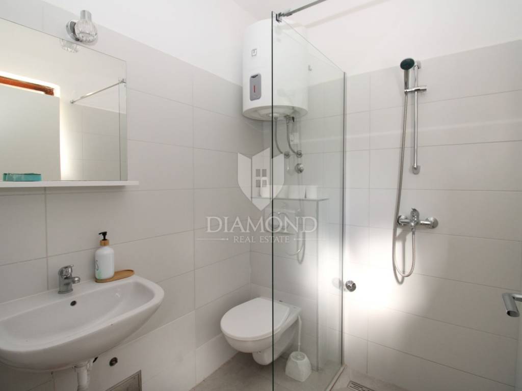 The apartment consists of a bedroom, a kitchen with a dining area, a bathroom, and a spacious terrace offering a beautiful view of the sea and the island of Krk. An added value is the 100 m² garden featuring a lovely stone barbecue – perfect for outdoor gatherings and enjoying the Mediterranean ambiance.