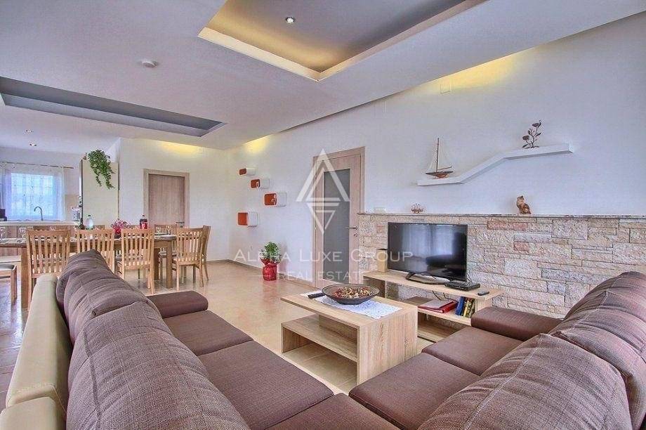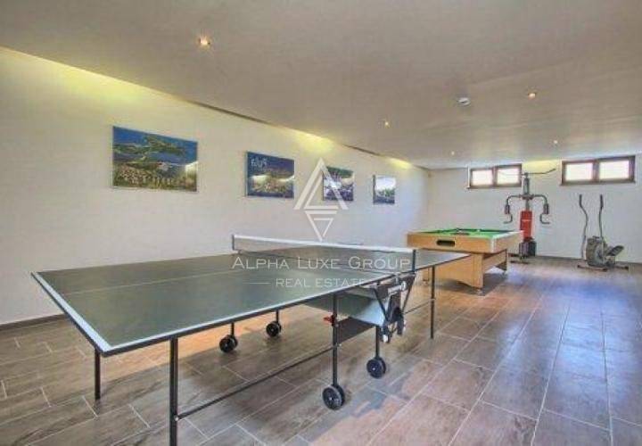 The villa has a living area of 294 m2 and a plot space of 2000 m2 distributed on the basement, ground floor, and upper floor. The house's basement has a multifunctional room with fitness equipment, a pantry, and a boiler room.