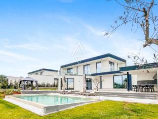 The villa has high-quality materials and a modern exterior and interior. It has underfloor heating, cooling air conditioners, solar panels, and a heated pool with a winter cover.