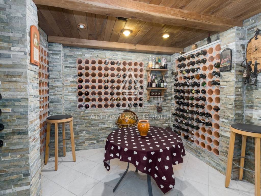 In the basement with a separate entrance there is a living room with a fireplace and a wine cellar, bathroom, and garage. The wine cellar is designed and built so that the room temperature is adapted to the storage of wine and consists of two rooms - the exhibition room and pantry, both adapted to the storage of wine bottles.