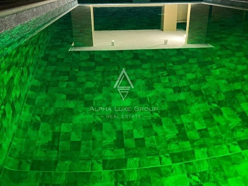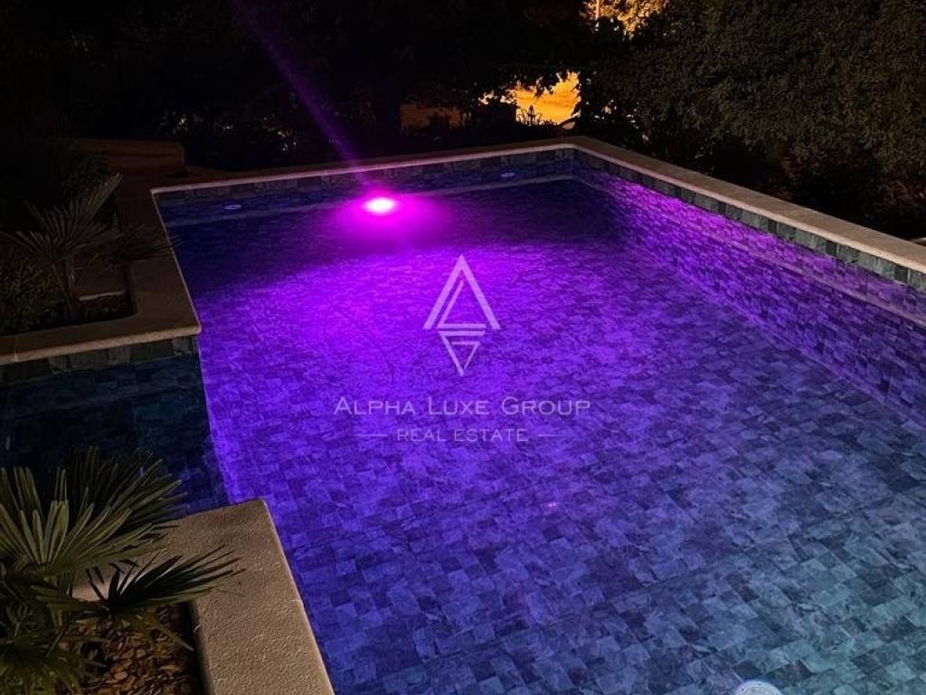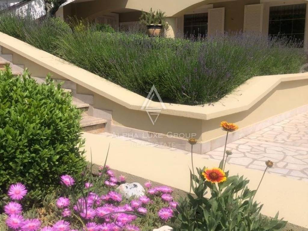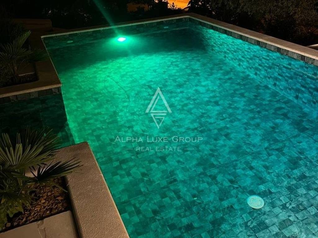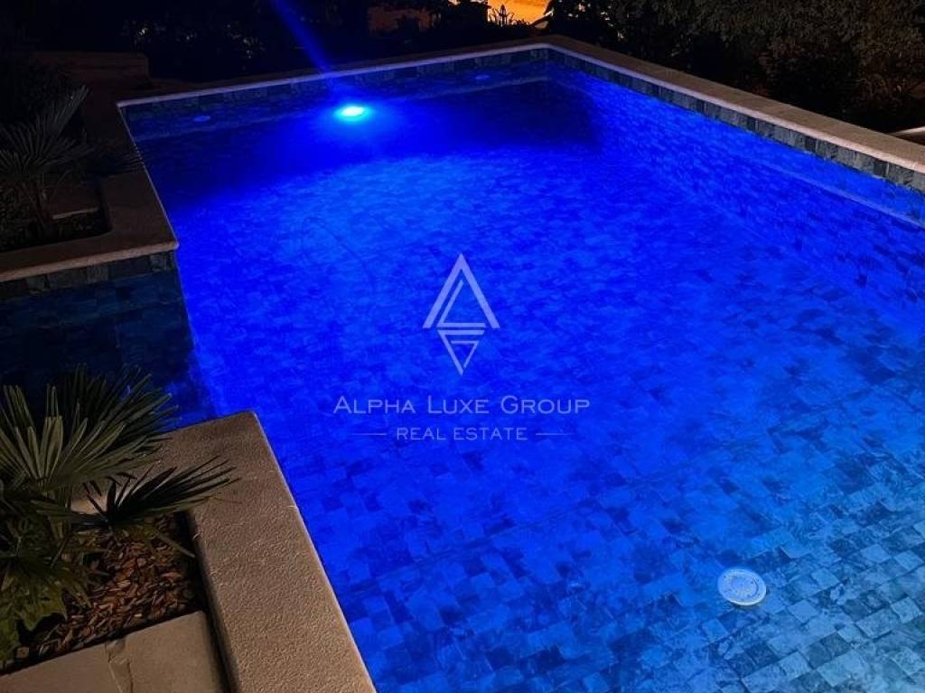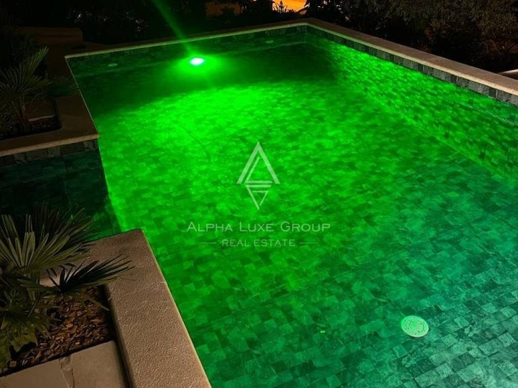 The spacious garden of this magnificent villa allows you to enjoy spending time with family and friends in the summer kitchen, where there is a barbecue with a dining table, swimming pool, and outdoor shower.