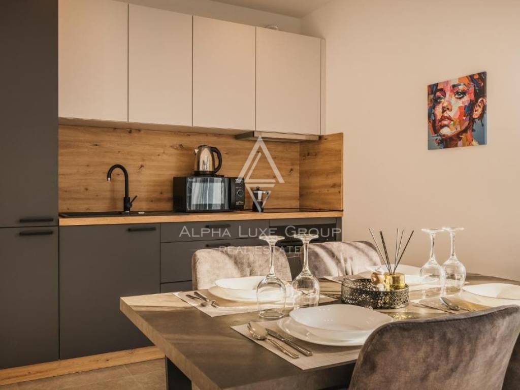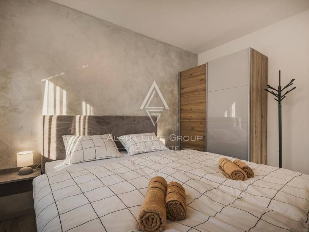 On the ground floor, there are two fully equipped apartments with direct access to a landscaped garden and swimming pool. Each apartment includes an open-plan living room with a kitchen and dining area, a bathroom, one spacious bedroom, and a terrace overlooking the pool. The apartments measure 46 m² and 65 m² and are fitted with electric underfloor heating in the bathrooms and inverter air conditioning.
