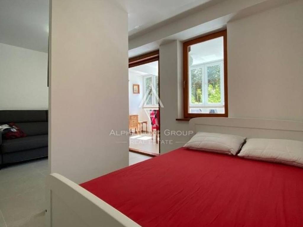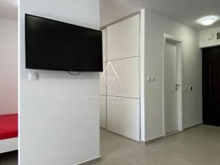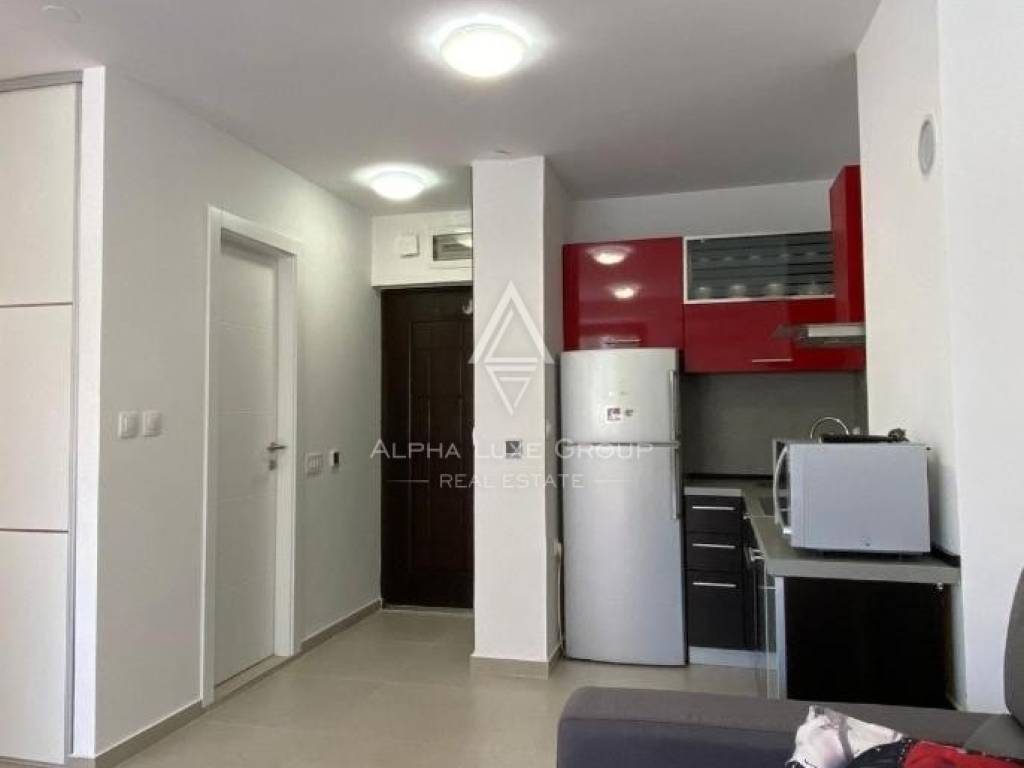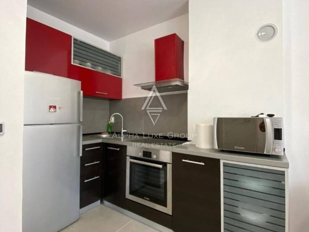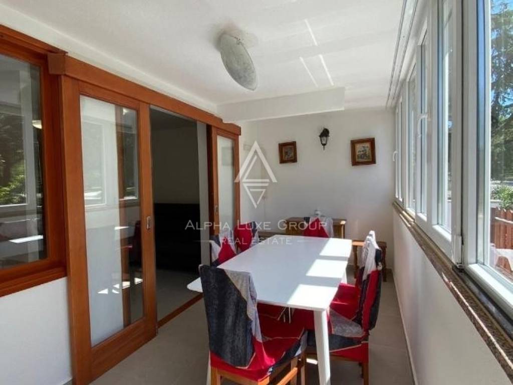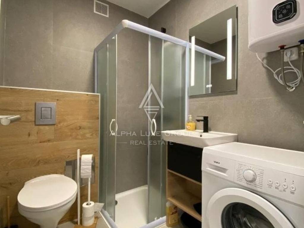 The apartment features a bright living room with a fully equipped kitchen, a cozy bedroom, a modern bathroom, and a spacious enclosed loggia with a dining area. Additionally, there is an open section of the balcony offering a serene view of lush greenery. With electric underfloor heating throughout and air conditioning, the apartment ensures comfort during all seasons. Public parking is conveniently available in front of the building.