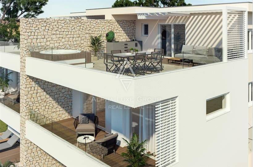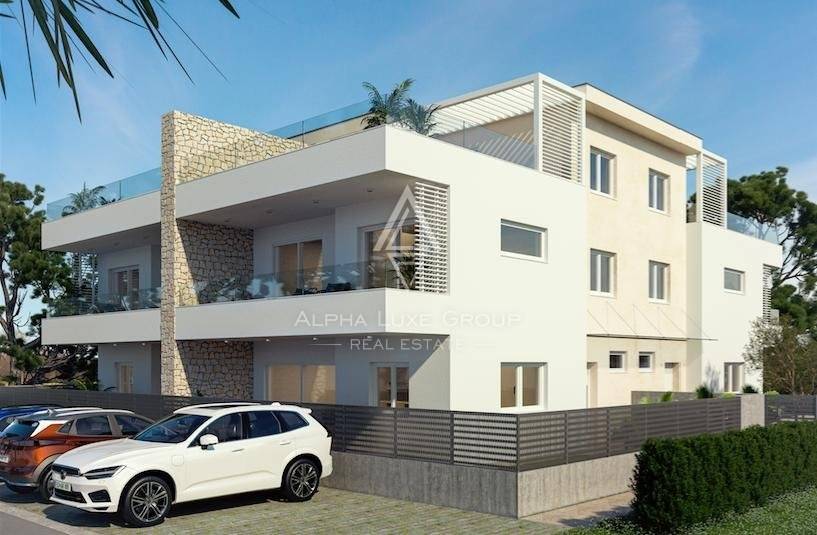 ALPHA LUXE GROUP exclusively sells a new modern semi-detached house only 1 km from the sandy beaches of Kanegra with a beautiful view of nature and a partial view of the sea.
