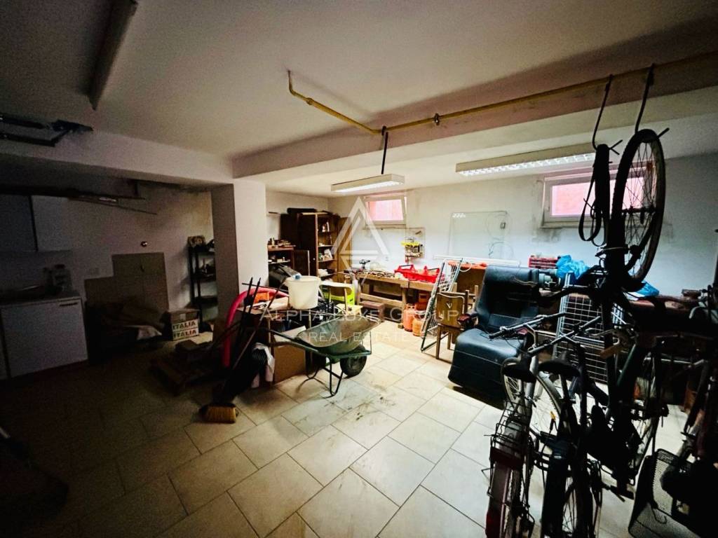 The basement offers additional living and utility spaces, including a second kitchen, a large living and dining area, another bedroom, a bathroom, and technical rooms for laundry or workshop use.