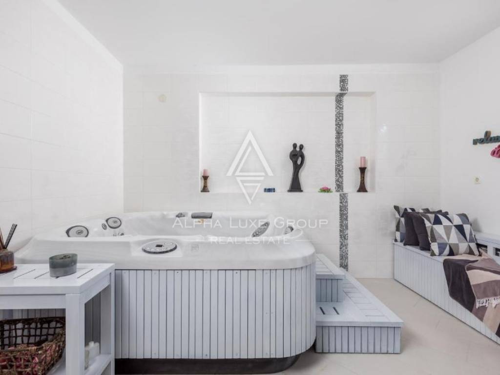 The exterior is highlighted by a freshwater swimming pool with an automatic system, a relaxing hot tub, and a beautifully landscaped garden with direct sea access. Additional features include a fully equipped gym, automatic gate and irrigation system, and central heating that ensures year-round comfort. Accessibility has been carefully planned, with facilities suitable for people with reduced mobility.