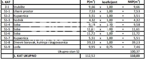 The apartment on the 1st floor of the building has a total gross area of 112.52 m2, net area of 110.03 m2, plus 2 outdoor parking spaces.