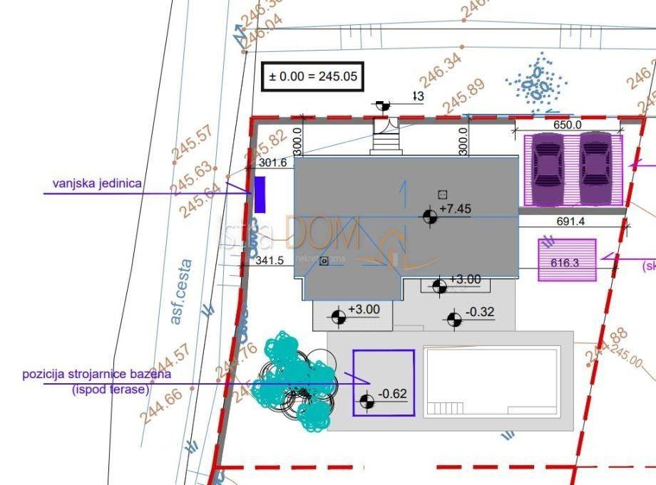 Zemljište se prostire na mjestu s prekrasnim pogledom prema moru (Rovinj), a u susjedstvu se nalaze moderne vile s bazenima, što dodatno povećava atraktivnost ovog područja. Infrastruktura je dostupna uz teren, a pripremni radovi za gradnju već su izvršeni. Također, građevinska dozvola je ishodovana, što omogućava trenutnu gradnju. Građevinski dio je 502m2 a poljoprivredni 1090m2