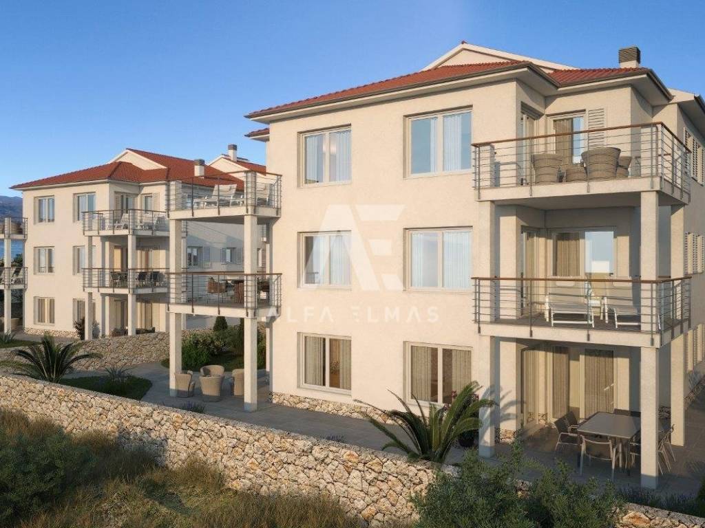 Šilo, new building, two-room apartment, first row to the sea!! Apartment on the high ground floor built in 2022 with a living area of ​​71.95 m2 consists of an entrance hall, toilet, bathroom, two bedrooms, living room, dining room and kitchen with access to the terrace and a storage room located in the basement of the residential building. Contemporary architecture with luxurious details and extremely high-quality equipment. Underfloor heating in the kitchen, dining room, living room and bathrooms, air conditioning with Wi-Fi module in every room, Marrazi ceramics, Laufen and Hansgrohe sanitary ware, burglar and fire doors at the entrance. The two-room apartment is only 50 m from the beach and 300 m from the center, these are just some of the many advantages of this sought-after location. Proximity to all necessary amenities as well as an unobstructed view of the sea are guaranteed. Documentation in order!! The parking space is not included in the price, there is a possibility to purchase a parking space of 3.12m2 net in the common yard at a price of 18,000E or a garage space of 6.25m2 net in the basement of the residential building at a price of 35,000E.