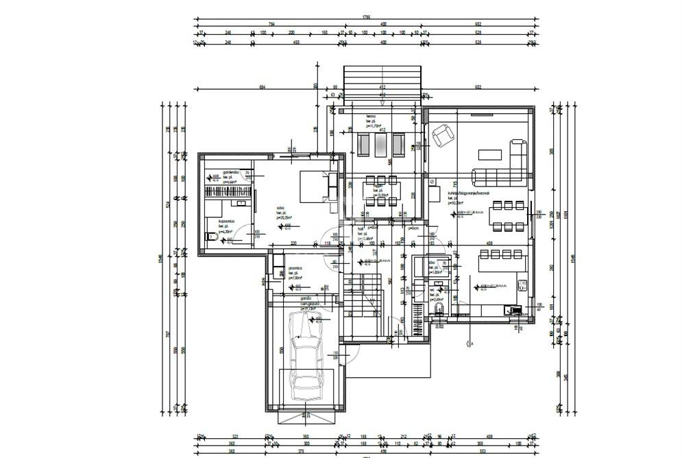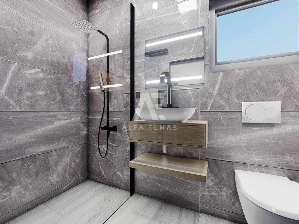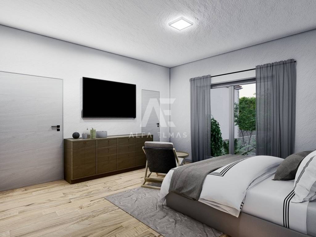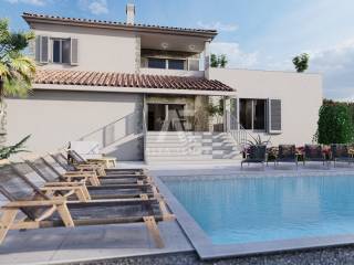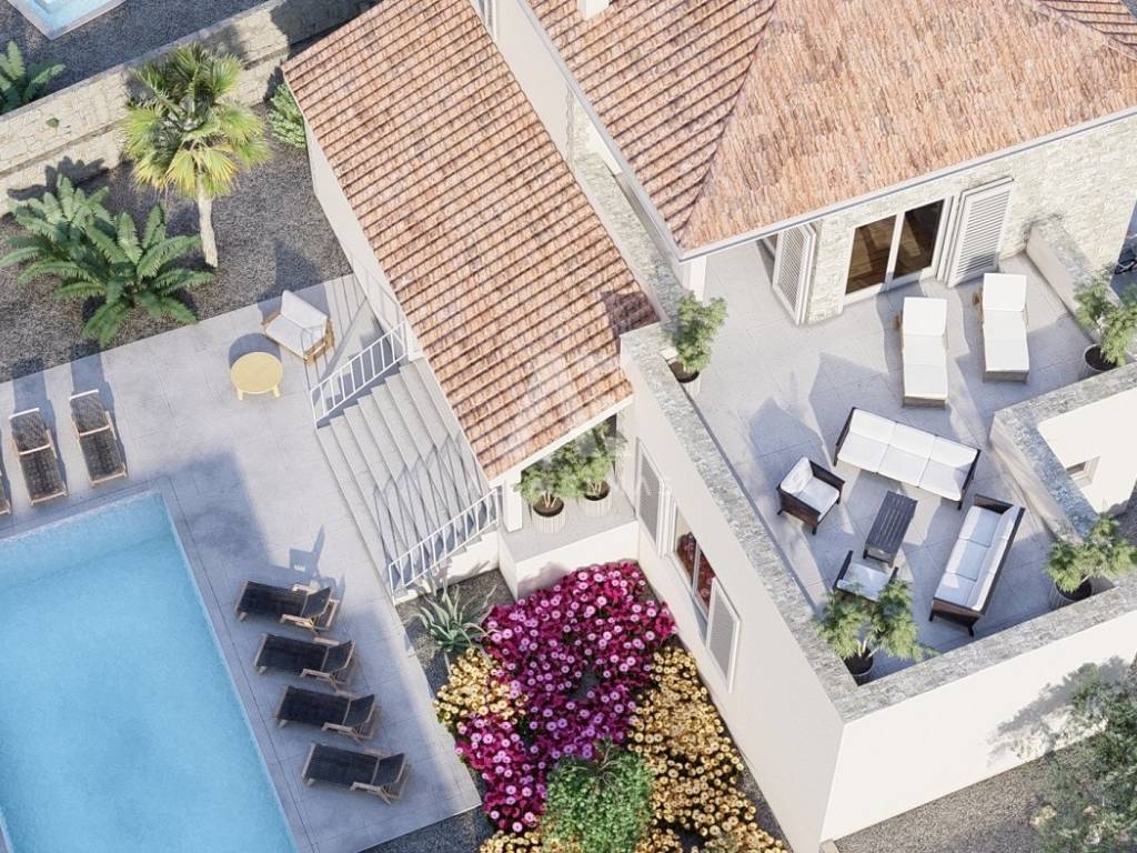Dobrinj, surroundings, luxurious detached stone house under construction in a quiet location, only 2800m from the sea. The property has a basement, ground floor and first floor, which extends to 300 m2 of living space, and is located on a plot of 910 m2. In the basement of the house there is a garage for one vehicle and internal stairs leading to the ground floor of the house. On the ground floor there is a spacious entrance hall, a guest toilet, a storage room, a master bedroom with its own bathroom and a walk-in closet, a kitchen, a dining room, and a spacious living room with a fireplace that make up the whole. From the living room there is an exit to the covered terrace, and to the spacious sunbathing area with a swimming pool. An internal staircase leads to the first floor, where there are three bedrooms, each with its own bathroom, and two rooms have access to a common terrace with a view of the beautiful surroundings. The facility's equipment is top-notch, including central underfloor heating, air conditioning in all rooms, high-quality ceramics, ALU joinery, and the floors will be covered with high-quality wooden parquets and ceramics. The furniture includes bathroom furniture. There is a large fireplace with a barbecue in the garden. The environment itself will be beautifully landscaped and equipped with an irrigation system
