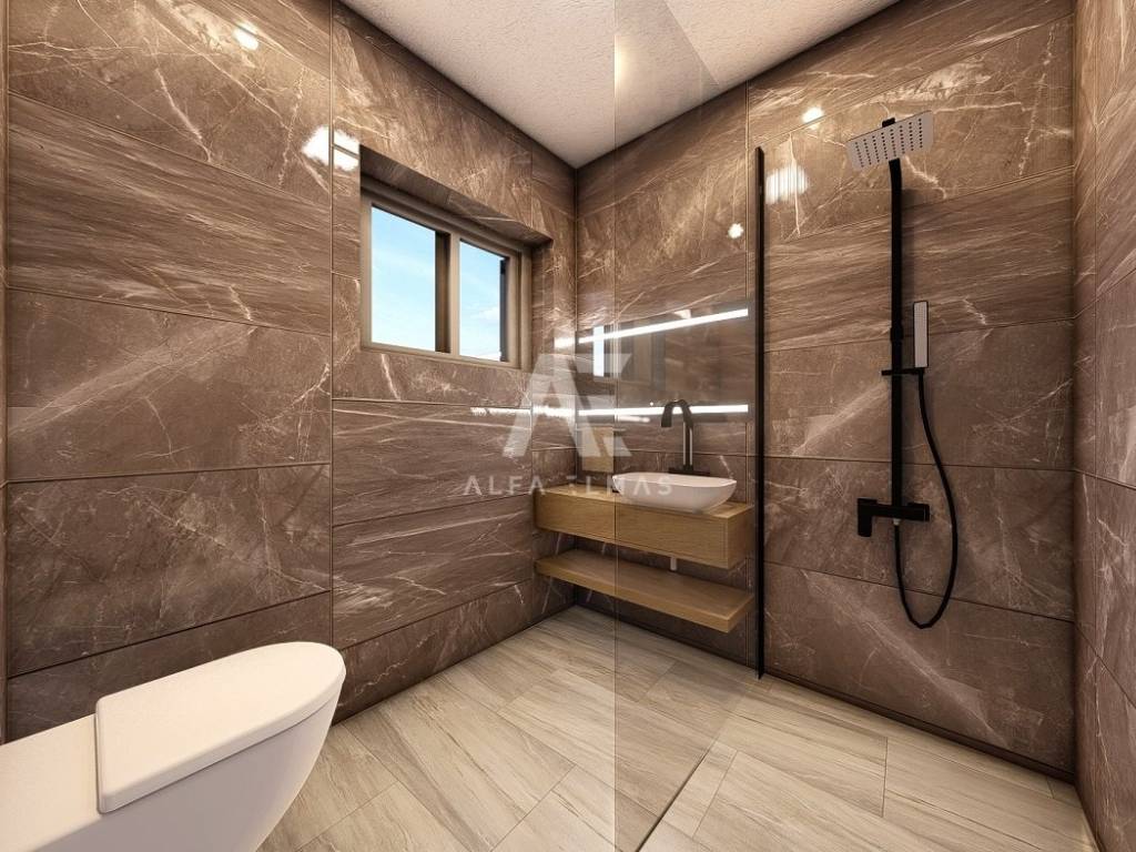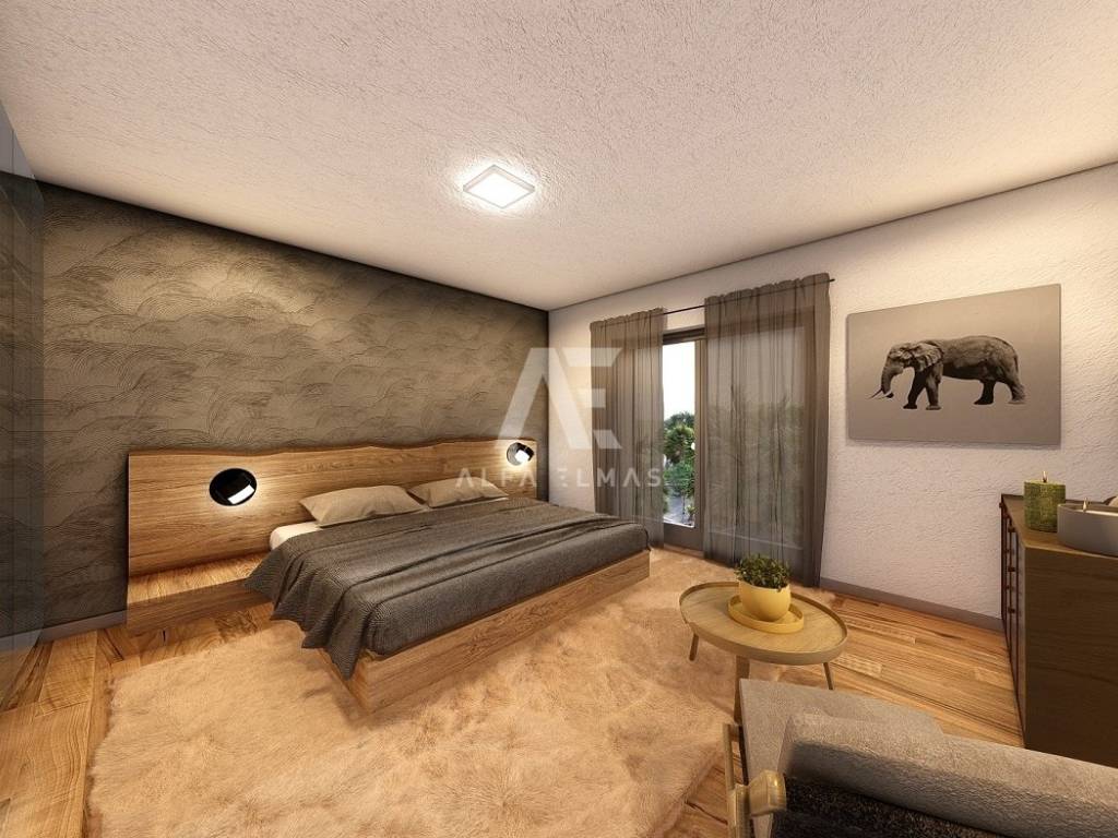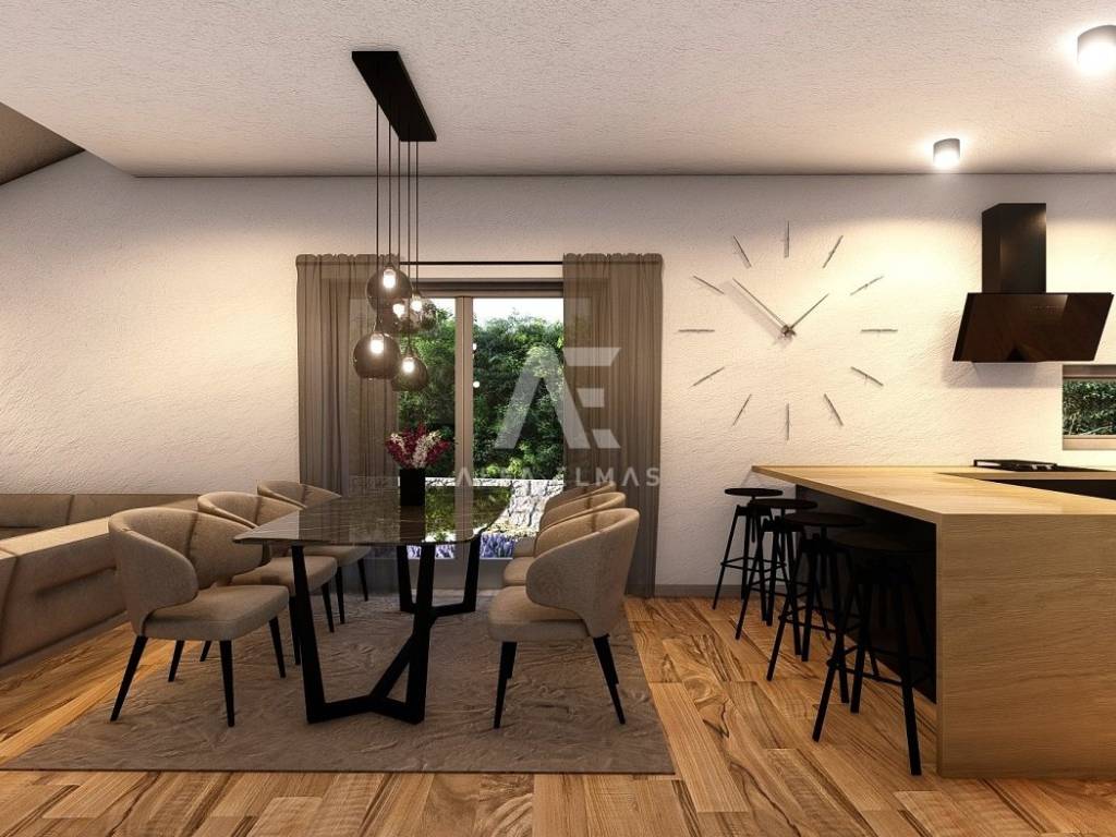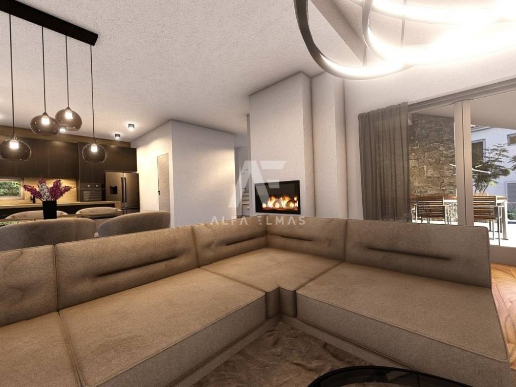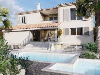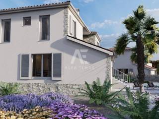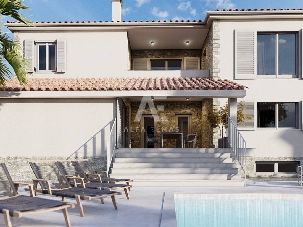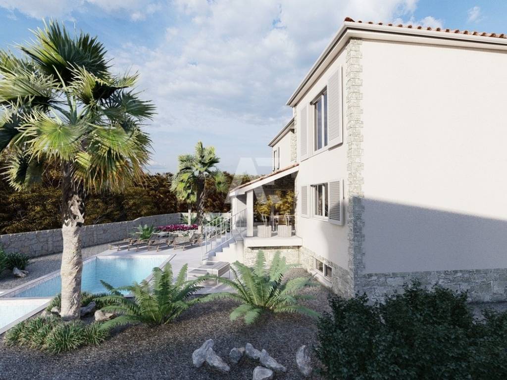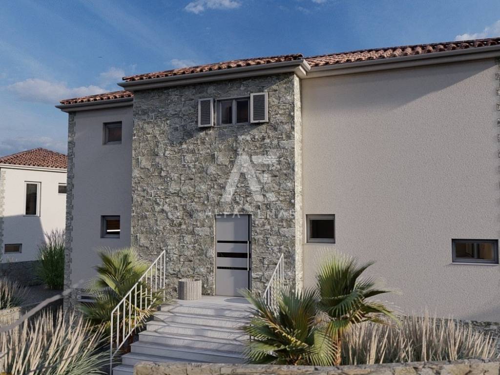 Dobrinj, surroundings, luxurious detached stone house under construction in a quiet location, only 2800m from the sea. The property has a basement, ground floor and first floor, which extends to 330 m2 of living space, and is located on a plot of 694 m2. In the basement of the house there is a garage for one vehicle and internal stairs leading to the ground floor of the house. On the ground floor there is a spacious entrance hall, a guest toilet, a storage room, a master bedroom with its own bathroom, a kitchen, a dining room, and a spacious living room with a fireplace that make up the whole. From the living room there is an exit to the covered terrace, and to the spacious sunbathing area with a swimming pool. An internal staircase leads to the first floor, where there are three bedrooms, each with its own bathroom, and two rooms have access to a common terrace with a view of the beautiful surroundings. The facility's equipment is top-notch, including central underfloor heating, air conditioning in all rooms, high-quality ceramics, ALU joinery, and the floors will be covered with high-quality wooden parquets and ceramics. The furniture includes bathroom furniture. There is a large fireplace with a barbecue in the garden. The environment itself will be beautifully landscaped and equipped with an irrigation system