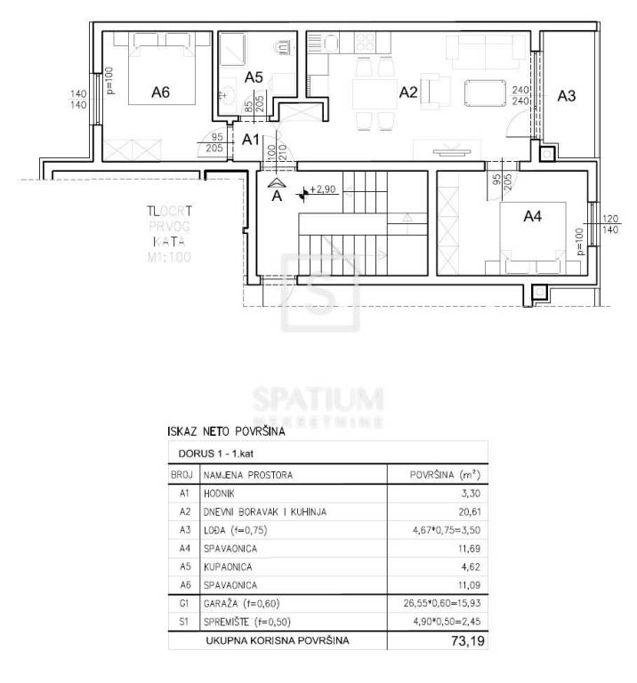 The apartment is located on the first floor of the building and has a total net surface area of 73.19 m², including the residential area, loggia, garage parking space, and storage room on the ground floor. The residential area of 54.81 m² consists of a spacious living room connected to the kitchen and dining area, two bedrooms, a bathroom, and a hallway, while the loggia provides a pleasant outdoor space for relaxation. The apartment is designed with an optimal layout, plenty of natural light, and a high level of comfort, making it ideal for family living as well as a long-term rental investment.