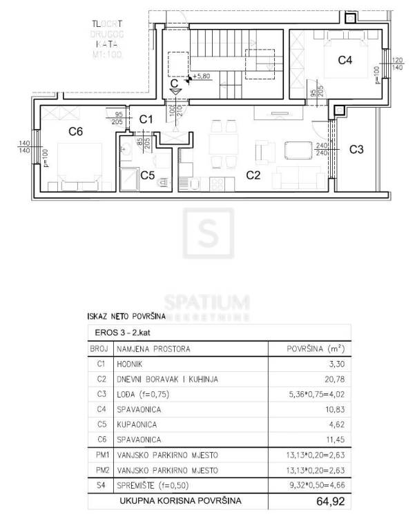 The apartment is located on the second floor of the building and has a total net surface area of 64.92 m², including the residential area, loggia, outdoor parking space, and a storage room on the ground floor. The residential area of 55 m² consists of a spacious living room connected to the kitchen and dining area, two bedrooms, a bathroom, and a hallway, while the loggia provides a pleasant outdoor space for relaxation. The apartment is designed with an emphasis on optimal layout, abundant natural light, and a high level of comfort, making it ideal for family living as well as a long-term rental investment.