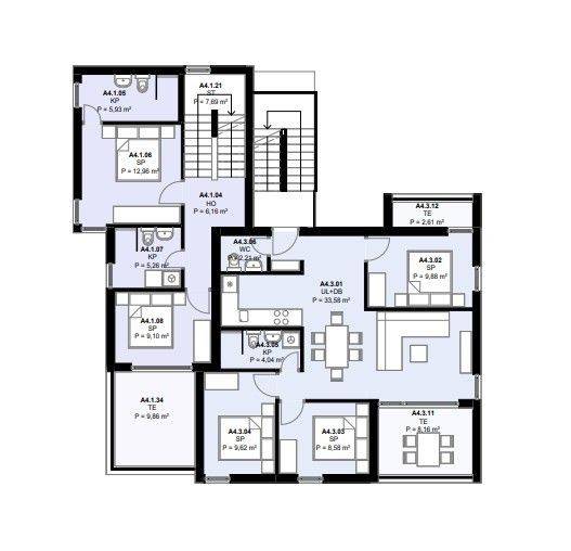 Entrance area and living room – 33.58 m² Bedroom 1 – 9.88 m² Bedroom 2 – 8.58 m² Bedroom 3 – 9.62 m² Bathroom – 4.04 m² WC – 2.21 m² Terrace – 10.77 m²