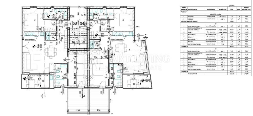 Apartment S3, with a total net area of 80.45 m², is situated on the first floor of the building and consists of an entrance hallway, open-plan kitchen with dining and living area, two bedrooms, two bathrooms, a laundry room, and a spacious covered terrace of 9.50 m².