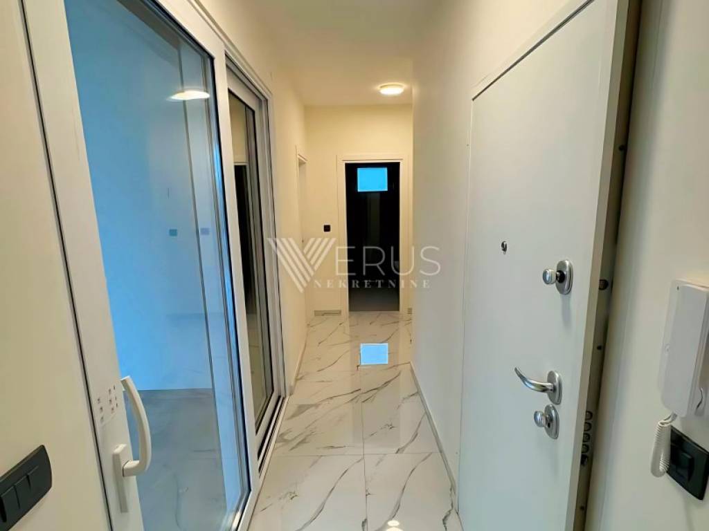 The apartment with a total living area of 102.61 m² was designed with an emphasis on functionality, comfort, and contemporary style. The entrance leads to a spacious hallway that continues into the open concept of the living room, kitchen, and dining room. Large glass walls connect the interior with a covered and open terrace that surrounds the apartment and offers an open view of the sea, creating the perfect space for relaxation and socializing.
