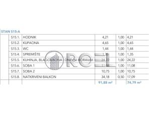 The apartment is located on the first floor of a modern new building with an elevator, NKP 74.79 m2. Very modern design of the building and built to the highest standards. It consists of a hallway (4.21 m2), storage room (1.35 m2), bathroom (4.65 m2), toilet (1.44 m2), kitchen, living room and dining room (24.22 m2), two bedrooms (11.08 and 10.75 m2) and a covered balcony of 34.18 m2 (17.09 m2). The living area of the apartment is 57.7 m2. The orientation of the apartment is north and west.