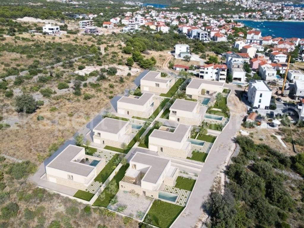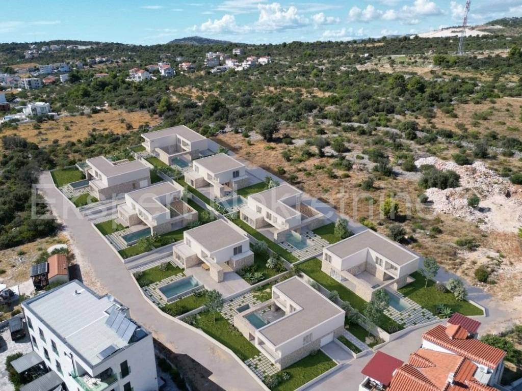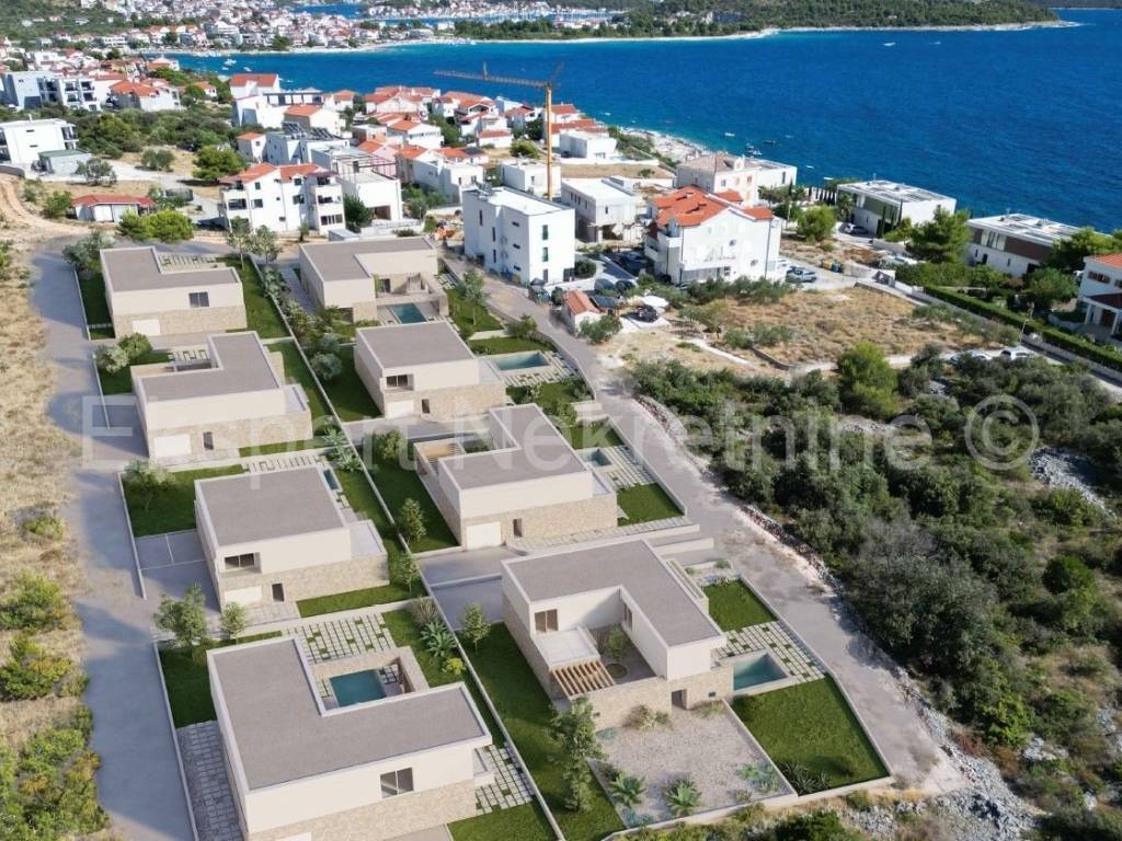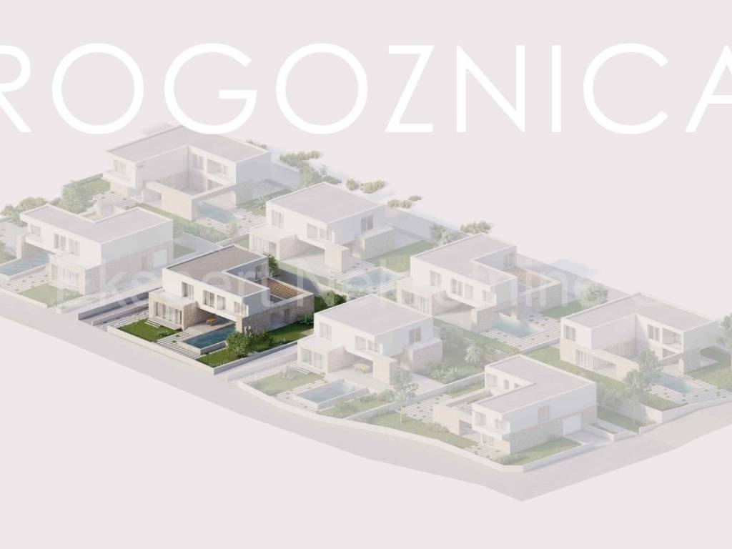Rogoznica, luxury villa 309 m2 with a 40 m2 swimming pool only 120 m from the sea and the beach. The villa is located on a plot of 806 m2.The villa is located on three floors (basement, ground floor and first floor). In the basement there is a machine room, technical room, staircase and entertainment area.On the ground floor there is an entrance hall, garage, hallway, kitchen with dining room and living room, bathroom, storage room, staircase, and a large outdoor covered terrace with a summer kitchen and a large swimming pool (40 m2).On the first floor, which is reached by an internal staircase, there is a hallway, 4 large bedrooms (one with its own bathroom and dressing room and a terrace, one with a bathroom and dressing room, one with a dressing room and a balcony and another room) and a bathroom, storage room and laundry room. All terraces offer a beautiful and open view of the sea, from which the plot is only 120 m away.The villa is located in a complex with 8 villas under construction, and has a valid building permit, and completion is planned for the end of 2026. Quality construction (underfloor heating, air conditioning in every room, PVC windows, mosquito nets, electric shutters, quality ceramics, partly stone facade, etc. The house is located in a peaceful and quiet location, only 120 meters from the sea and the nearby beach where the sea is crystal clear. Ownership is in order.For more info, contact the agency..