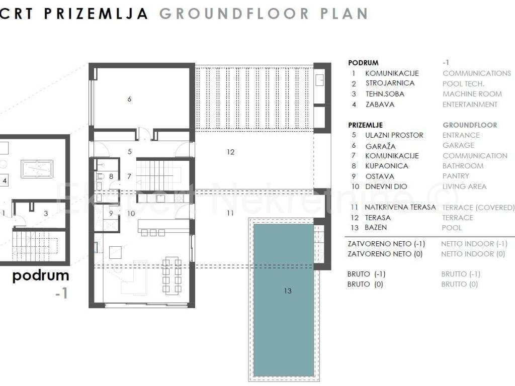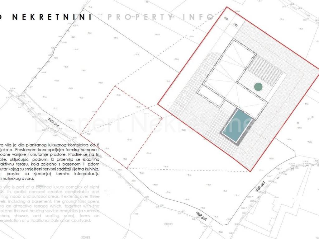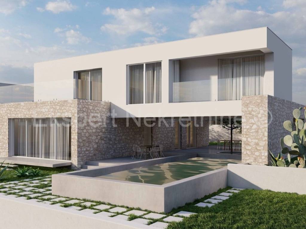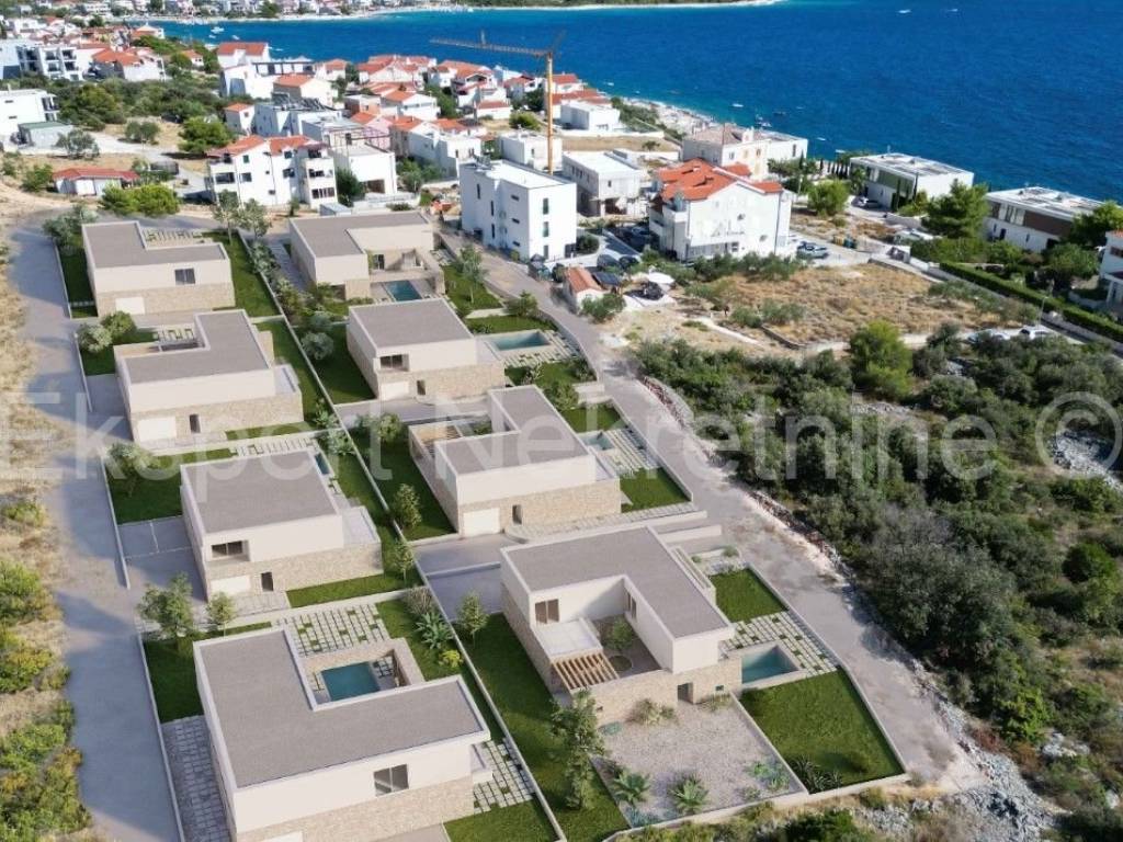 Rogoznica, luxury villa 309 m2 with a 40 m2 swimming pool only 120 m from the sea and the beach. The villa is located on a plot of 806 m2.The villa is located on three floors (basement, ground floor and first floor). In the basement there is a machine room, technical room, staircase and entertainment area.On the ground floor there is an entrance hall, garage, hallway, kitchen with dining room and living room, bathroom, storage room, staircase, and a large outdoor covered terrace with a summer kitchen and a large swimming pool (40 m2).On the first floor, which is reached by an internal staircase, there is a hallway, 4 large bedrooms (one with its own bathroom and dressing room and a terrace, one with a bathroom and dressing room, one with a dressing room and a balcony and another room) and a bathroom, storage room and laundry room. All terraces offer a beautiful and open view of the sea, from which the plot is only 120 m away.The villa is located in a complex with 8 villas under construction, and has a valid building permit, and completion is planned for the end of 2026. Quality construction (underfloor heating, air conditioning in every room, PVC windows, mosquito nets, electric shutters, quality ceramics, partly stone facade, etc. The house is located in a peaceful and quiet location, only 120 meters from the sea and the nearby beach where the sea is crystal clear. Ownership is in order.For more info, contact the agency..