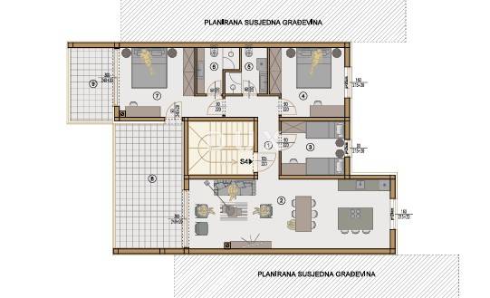 In the quiet and attractive Valdebek settlement in Pula, only about 3 km from the sea and the city center of Pula, there is a modernly designed new building of high quality. As part of the project, this extremely attractive penthouse is offered, which represents the perfect combination of comfort, privacy and a modern way of living.