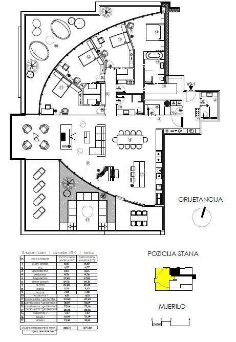 Prodaje se 5-sob. penthouse stan/apartman na 9. katu, oznake V9-1, površine 274,69 m2, koji se sastoji od ulaznog prostora, wc-a, gospodarstva, predprostora, blagovaonice, dnevnog boravka, kuhinje, ostave, hodnika, 4 spavaće sobe svaka sa svojom garderobom, kupaonice 2 i 2 terase.