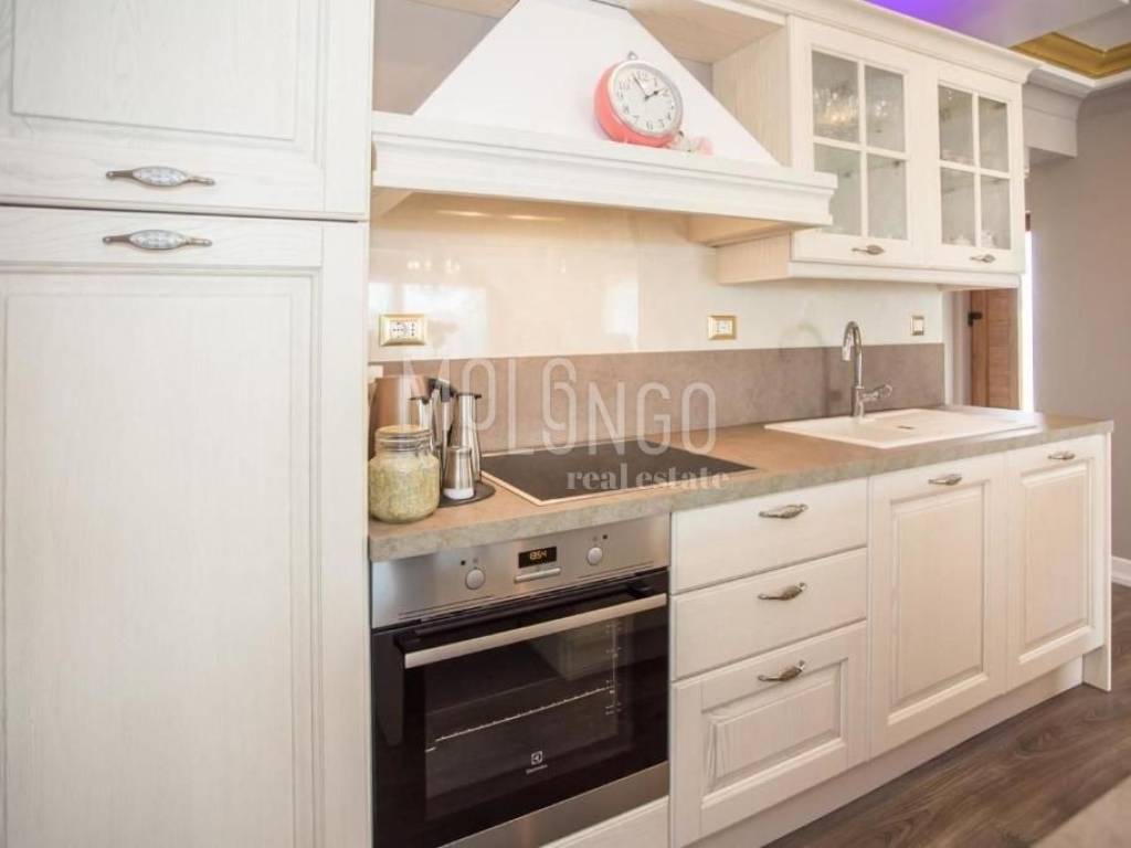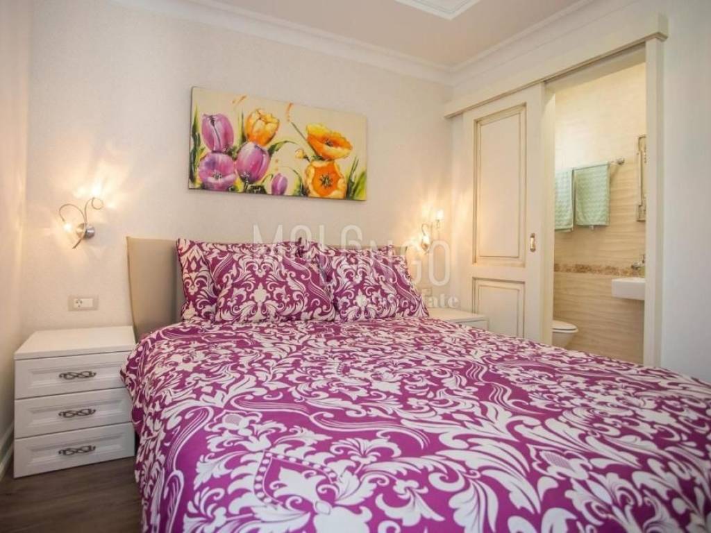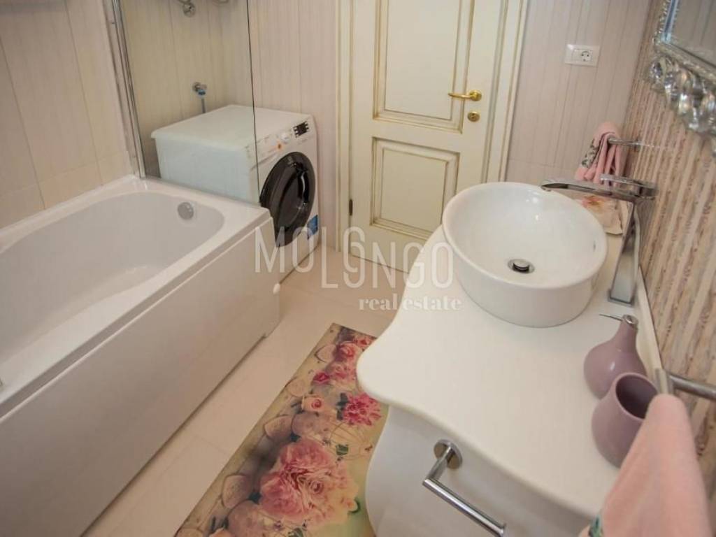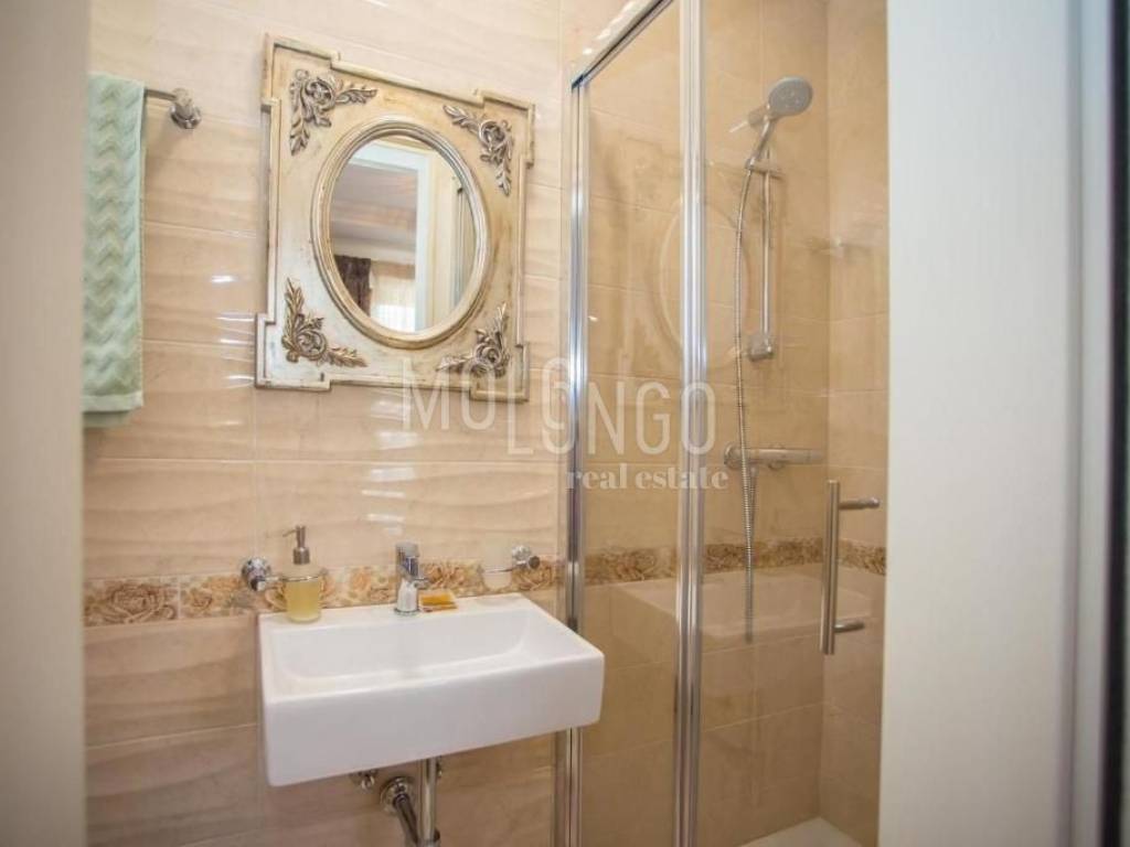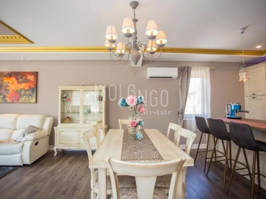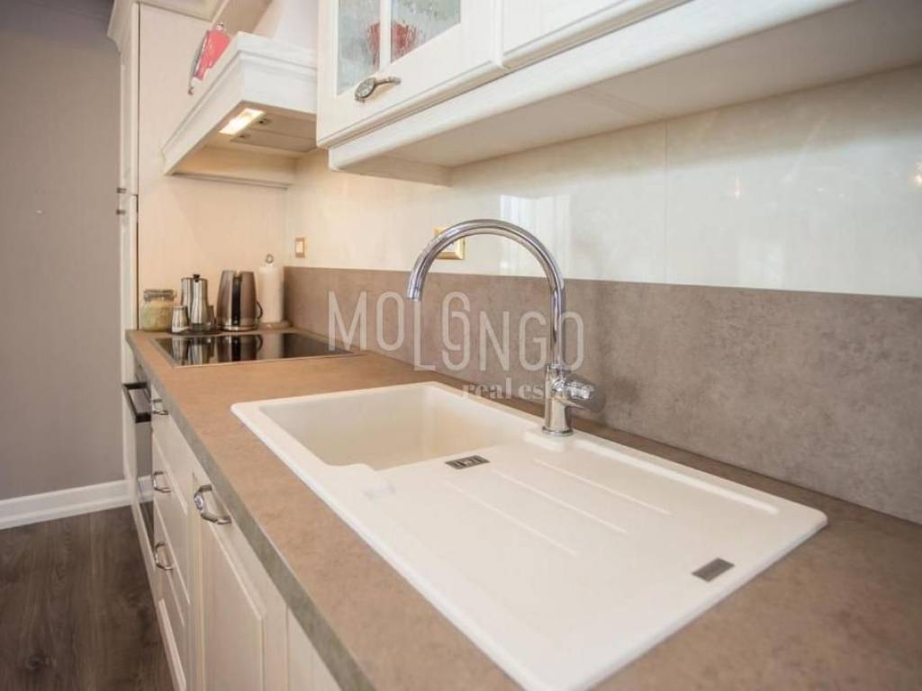 The house consists of an entrance hall from which you enter the open floor plan, which contains a kitchen with an island, a dining room and a living room, which is separated by a glass wall from the outdoor area with a swimming pool and sunbathing area. The house has 2 bedrooms and 2 bathrooms, one of which is part of the room. There are many charming details throughout the house, from light fixtures and ambient lighting in the kitchen to mirrors in the bathrooms, and the gold-colored stucco on the ceiling looks especially gorgeous. There is space for the construction of another building on the land next to the house, should the new owner wish to do so.