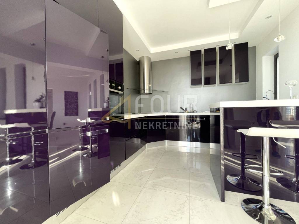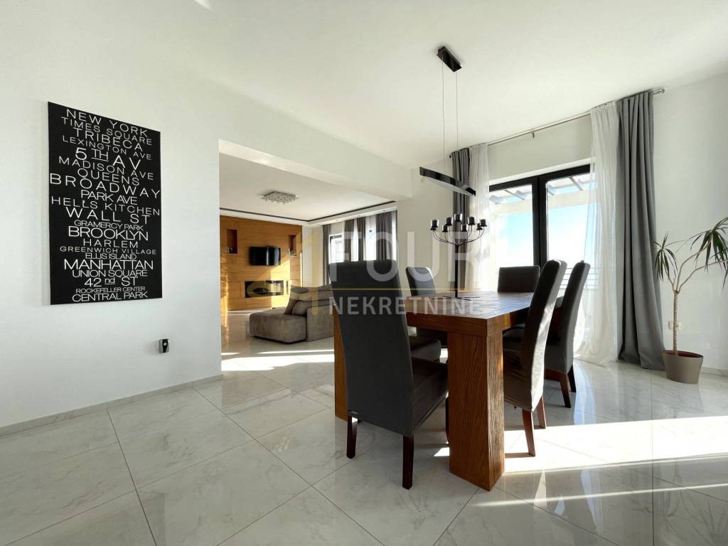 For rent, a spacious, modernly decorated apartment of 198.12 m2 located in a villa with a beautiful view of the sea. The apartment consists of three bedrooms, one of which has a walk-in closet, a spacious living room in an open concept with a kitchen and dining room, a bathroom, a toilet with an anteroom for a washing machine and additional storage, and a hallway. The outer wall of the living room is made of glass, providing access to the balcony and terrace with a beautiful view of the sea. The terrace is located in the part of the kitchen and dining room, and the balcony stretches the entire length of the house, with an exit from two bedrooms and the living room.