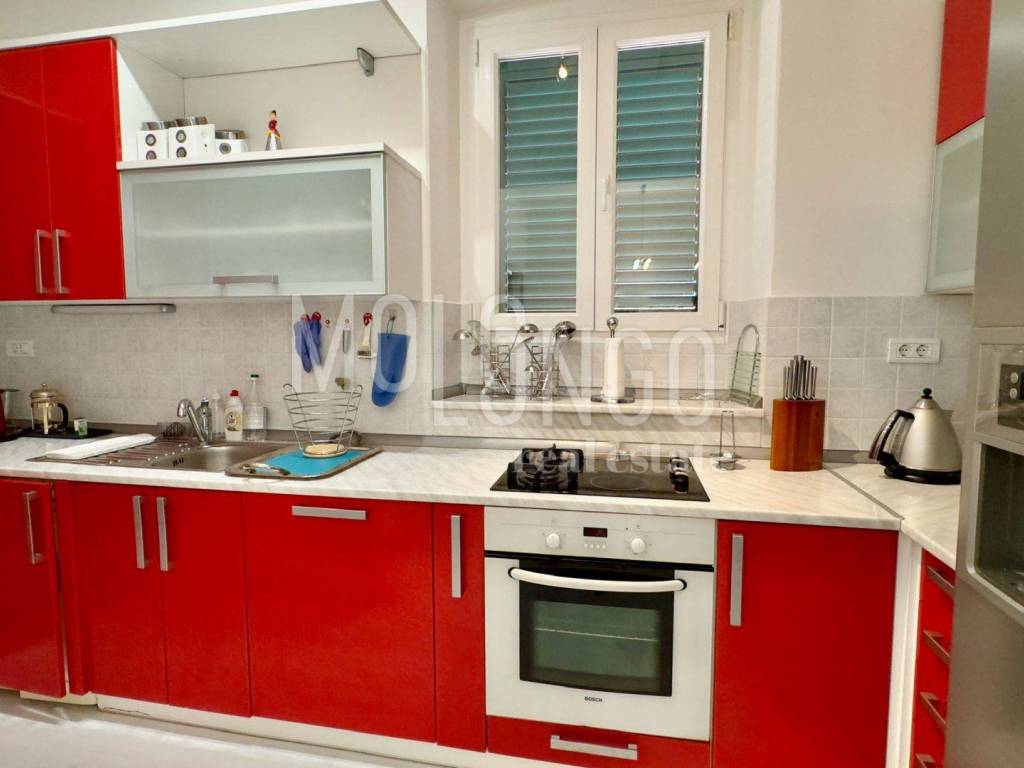 The kitchen is fully equipped and functional, with a dining table as well. From the kitchen, there is access to a larger balcony, offering a beautiful view over the city rooftops and a partial view of the sea, which is just 200 meters from the apartment.