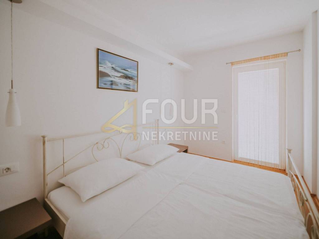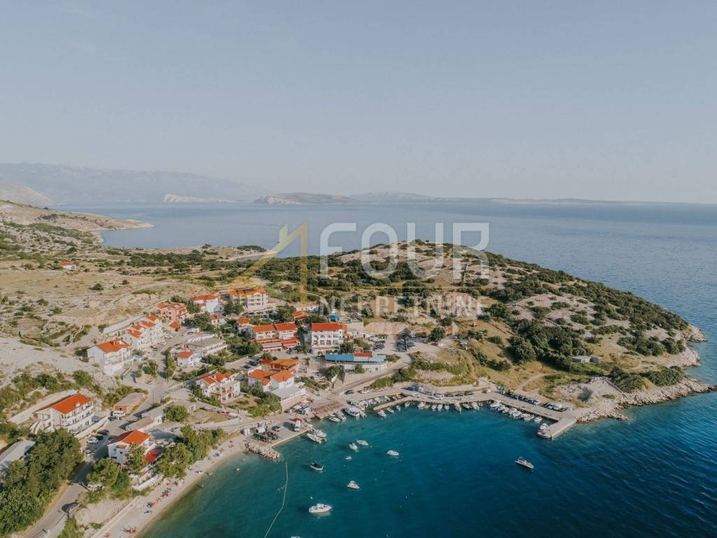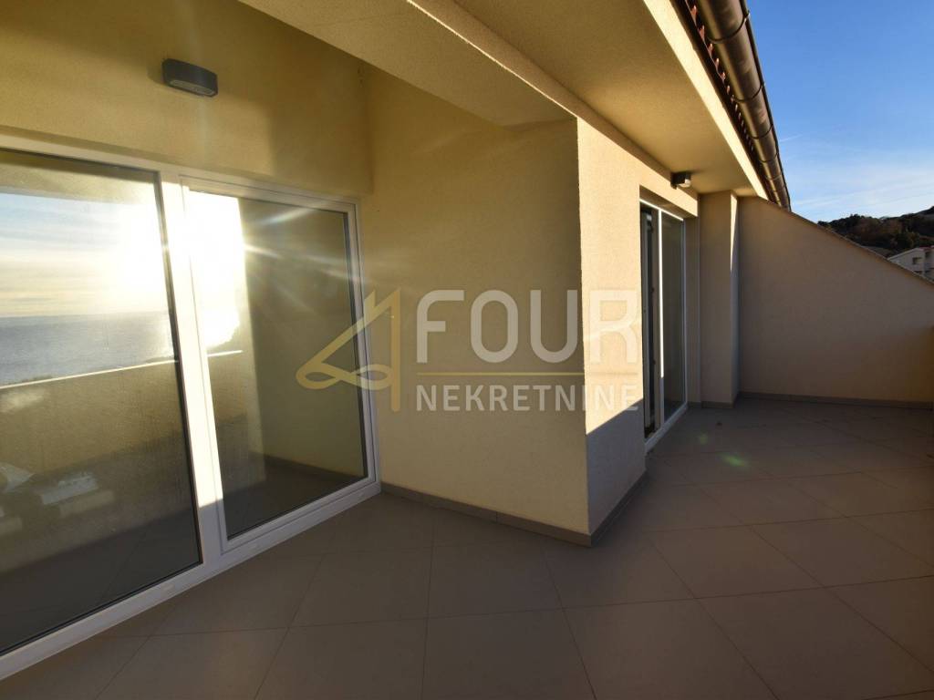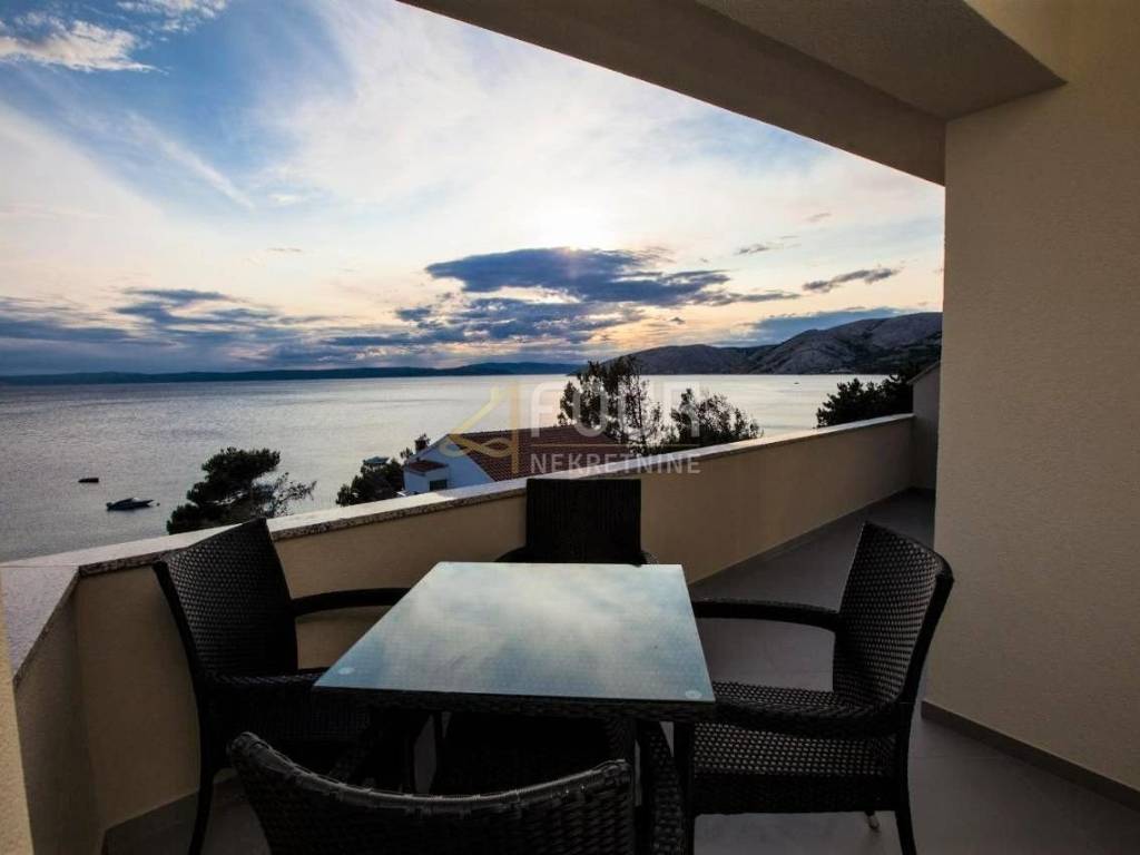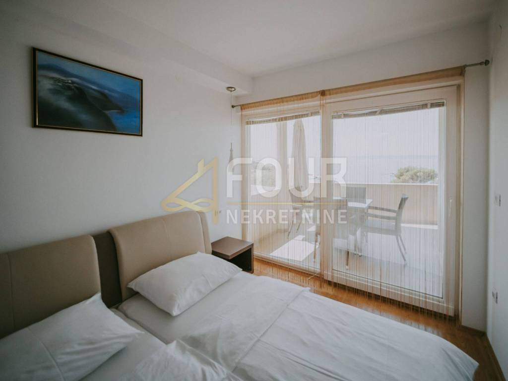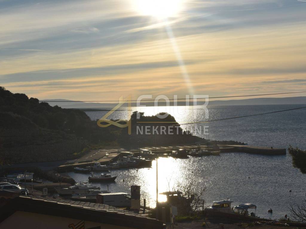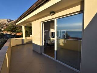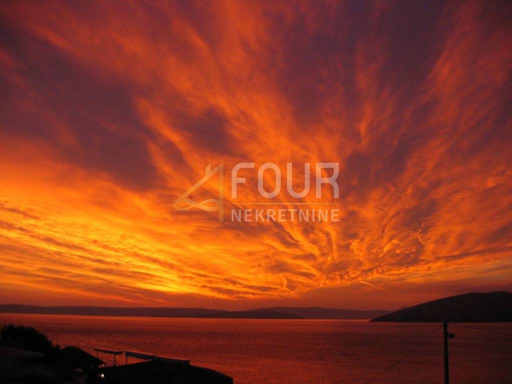 Only 30 meters from the sea and the beach on the island of Krk, in the small quiet town of Stara Baška, we are selling a 110 m2 apartment. The apartment is located on the 1st floor of a building with a total of six apartments. It consists of a kitchen with a dining room and living room in an open space, an entrance hall, a bathroom, a storage room, 2 bedrooms and a large terrace. The living room and both bedrooms open onto a spacious terrace of 77 m2 with a wonderful view of the sea and the surrounding islands. Part of the terrace of 15 m2 is covered and there is a possibility of connecting it to the residential part. The carpentry is PVC, the heating and cooling is solved with a Daikin multisplit air conditioner. The apartment has one outdoor parking space, and there is a possibility to purchase a garage on the ground floor.