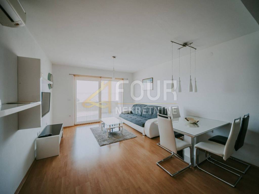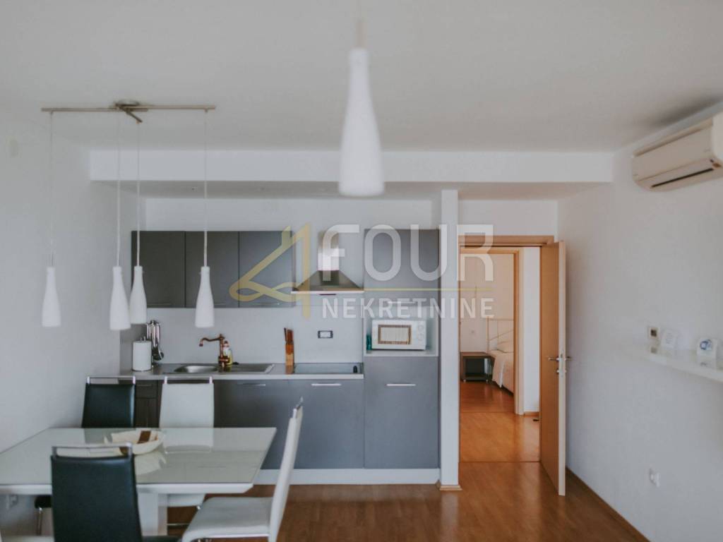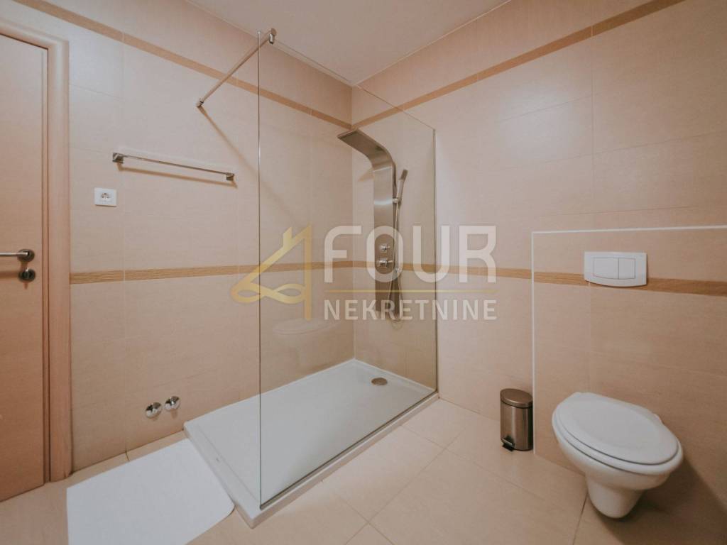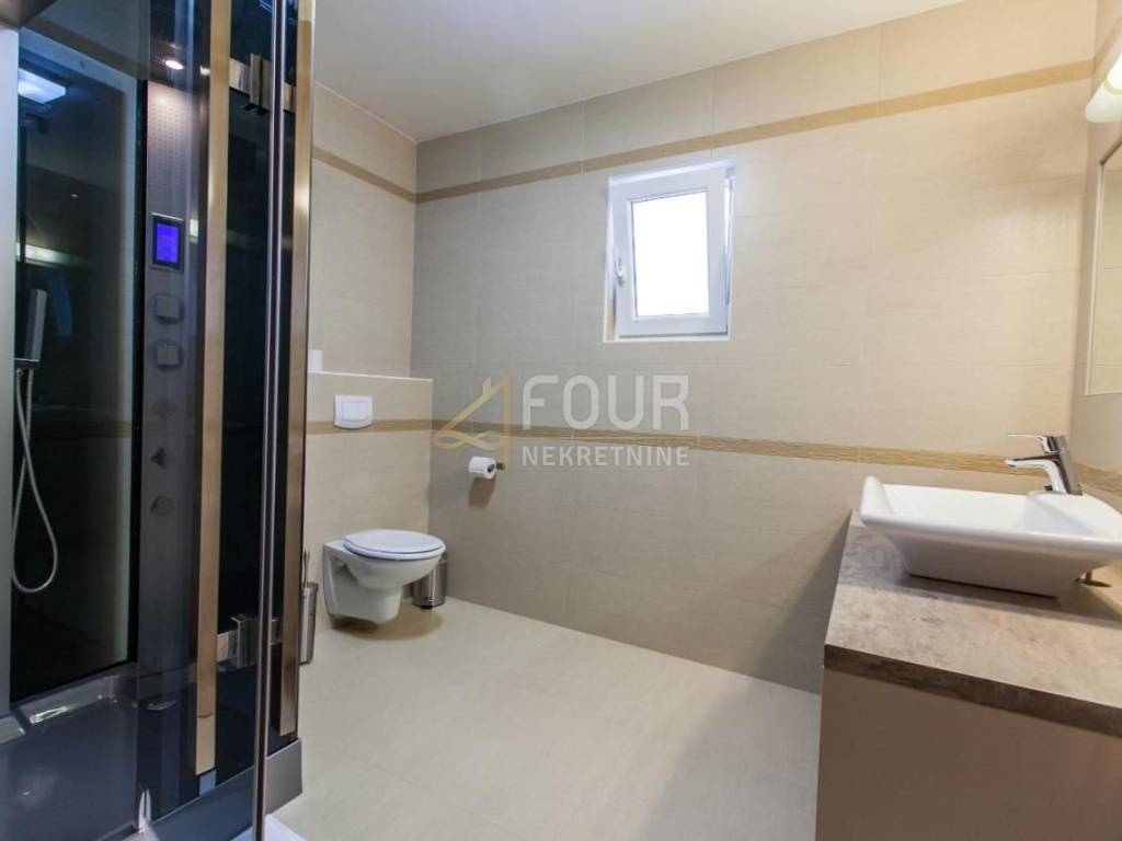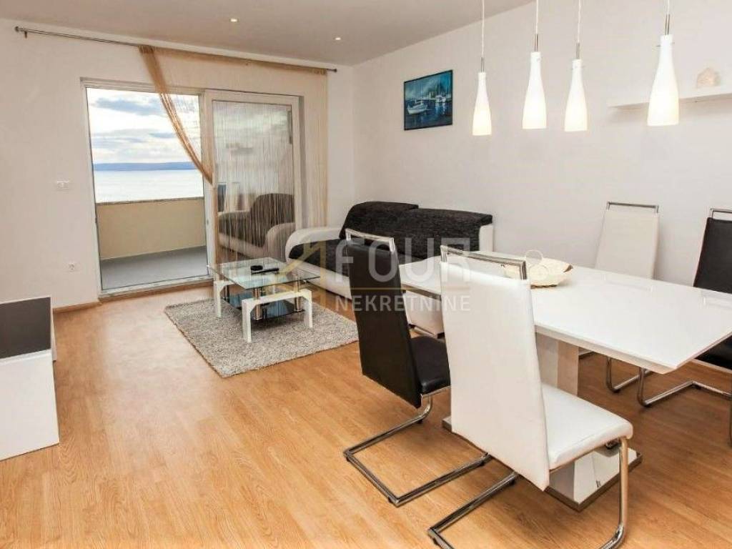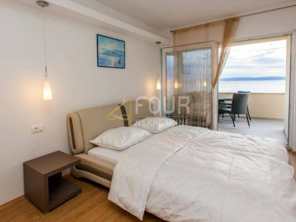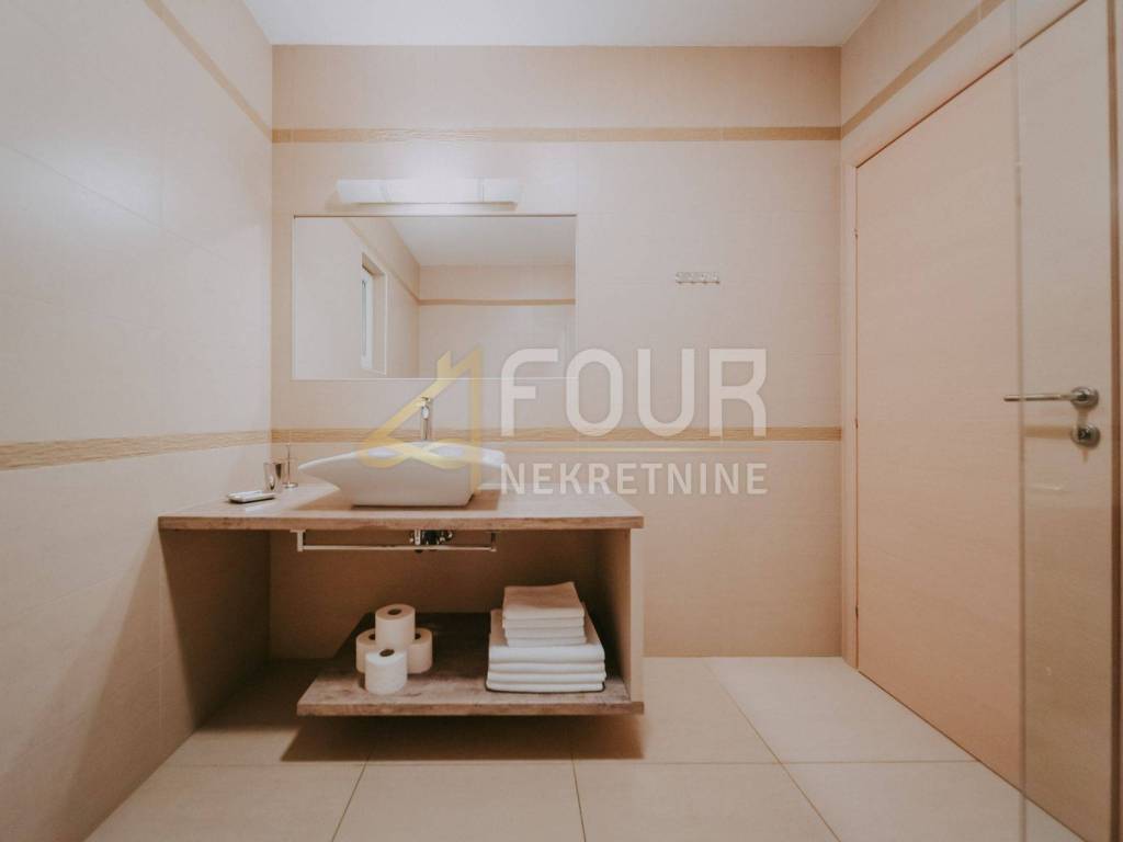 Only 30 meters from the sea and the beach on the island of Krk, in the small quiet town of Stara Baška, we are selling a 110 m2 apartment. The apartment is located on the 1st floor of a building with a total of six apartments. It consists of a kitchen with a dining room and living room in an open space, an entrance hall, a bathroom, a storage room, 2 bedrooms and a large terrace. The living room and both bedrooms open onto a spacious terrace of 77 m2 with a wonderful view of the sea and the surrounding islands. Part of the terrace of 15 m2 is covered and there is a possibility of connecting it to the residential part. The carpentry is PVC, the heating and cooling is solved with a Daikin multisplit air conditioner. The apartment has one outdoor parking space, and there is a possibility to purchase a garage on the ground floor.